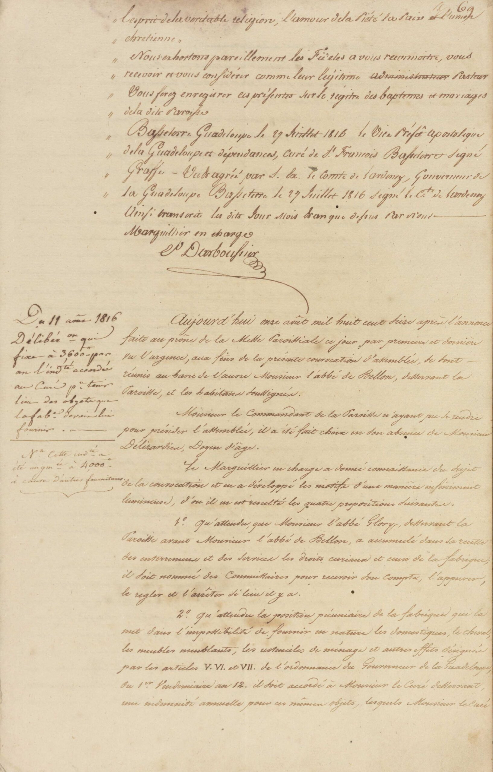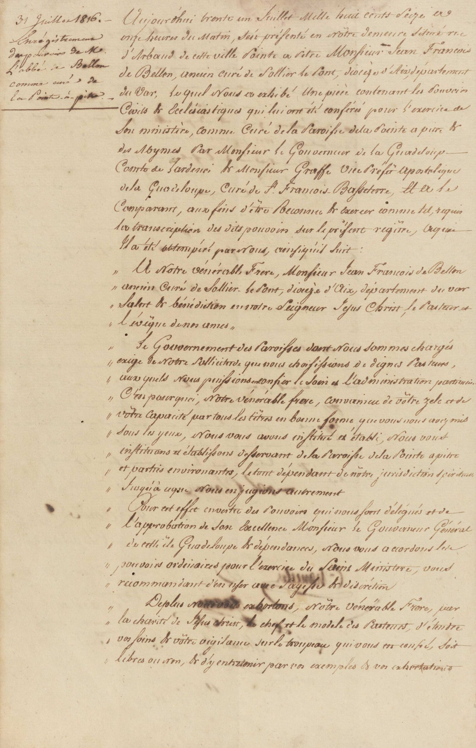 Voici donc un extrait du registre du conseil de fabrique de la paroisse de Pointe-à-Pitre en date du 31 juillet 1816. Il présente les lettres de nomination d’un nouvel abbé Jean François de Bellon, auparavant curé de Solliès-le-Pont dans le Var. On constate que la nomination s’est effectuée sous l’égide du vice préfet apostolique de la Guadeloupe et dépendances, Monseigneur Graffe, avec l’approbation de son excellence le comte Lardenoy, gouverneur de la Guadeloupe. Tous deux recommandent au nouveau desservant d’user « avec sagesse et discrétion » de ses pouvoirs ordinaires dans « l’exercice de son Saint Ministère ». Nous sommes à l’époque de la restauration royaliste après la Révolution et l’Empire et l’occupation anglaise.