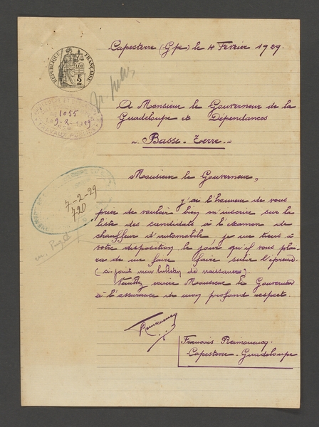 Lettre signée de François Reimonencq du 4 février 1929. Arch. dép. Guadeloupe, INC 49/1.