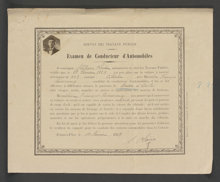 Le 4 février 1929, François Reimonencq, un jeune homme originaire de Capesterre-Belle-Eau sur la Basse-Terre, sollicite du gouverneur l’autorisation de se présenter à « l’examen de chauffeur automobile […] le jour qu’il vous plaira de me faire subir l’épreuve ». Se faisant, François Reimonencq obéit aux exigences du code de la route qui depuis 1901, impose aux apprentis conducteurs d’obtenir un certificat de capacité, délivré par le gouverneur après avis de l’ingénieur des Travaux publics. En 1929, l’examen prend la forme d’une unique épreuve de conduite effectuée sous le contrôle d’un mécanicien de l’administration, en l’occurrence « le chef de l’atelier des engins mécaniques de la Basse-Terre », un certain Stéphane Olivier. Ici, pas de voiture-école pas de moniteur ni de longue liste d’attente, mais le candidat doit fournir lui-même la voiture qui servira au test. Pour François Reimonencq, il s’agit d’une Citroën torpédo Type C de 3 places, achetée quelques années plus tôt par Jules Charneau, un importateur dont la famille s’est investie très tôt dans l’automobile, les transports publics, la location et la réparation des véhicules à moteur.