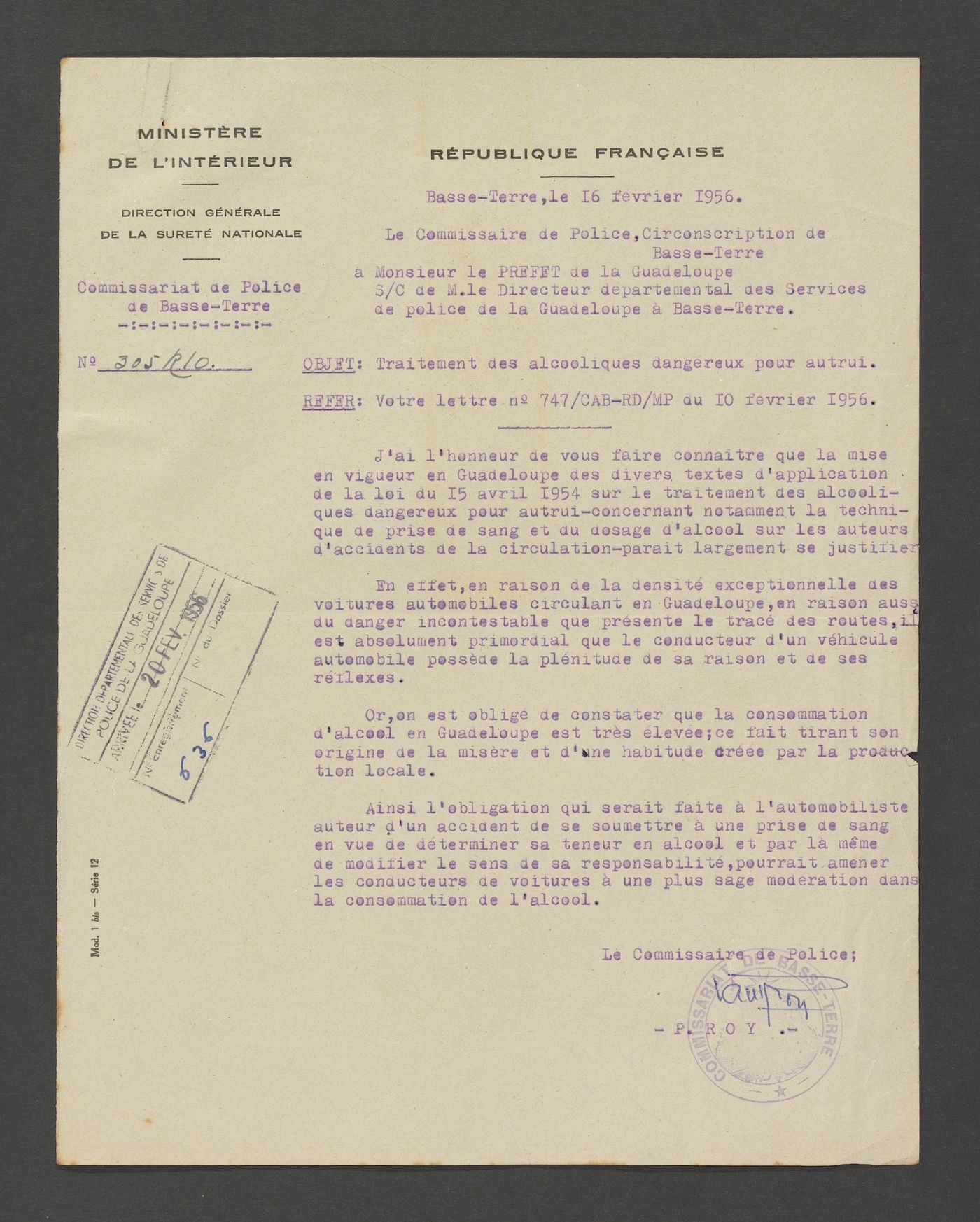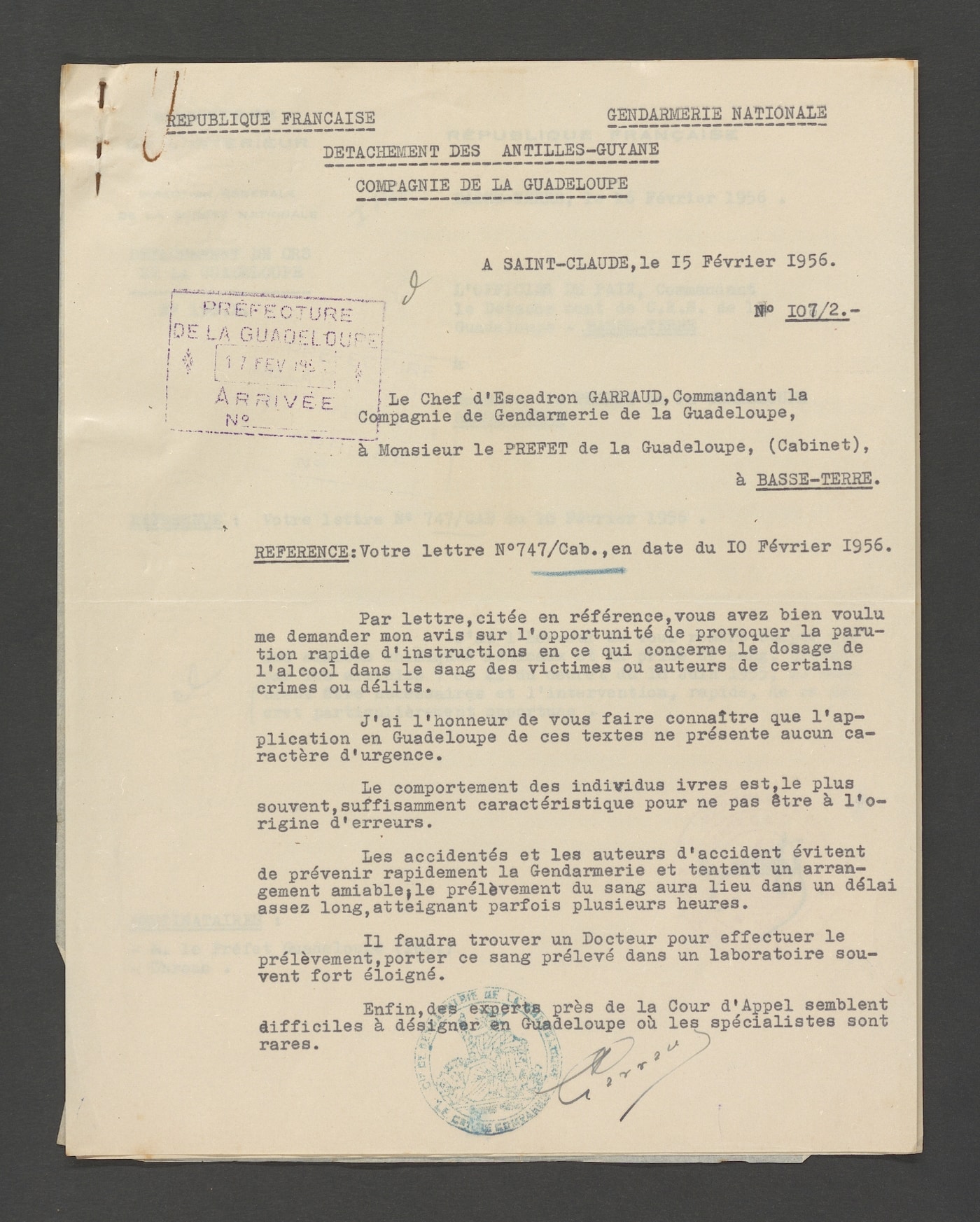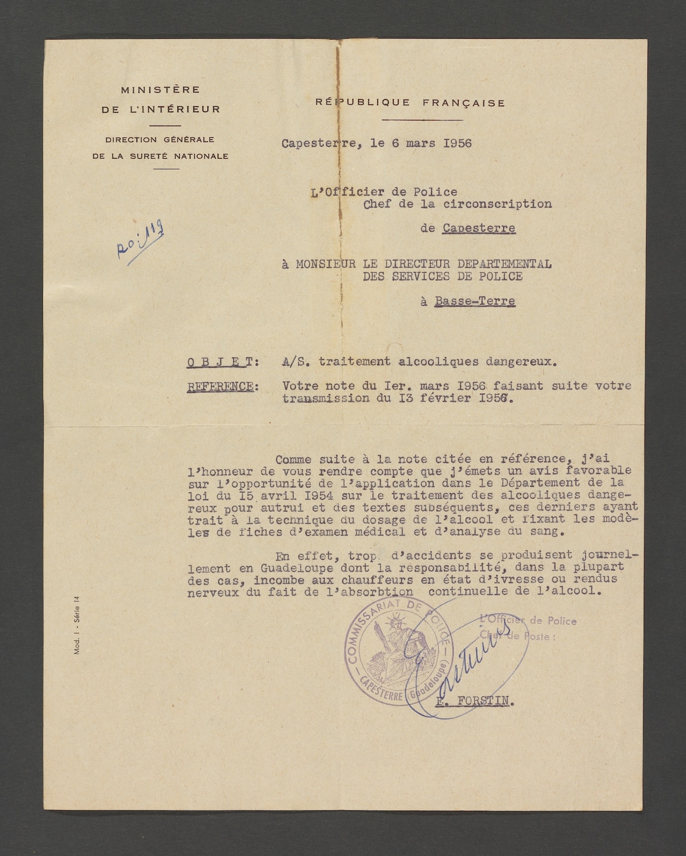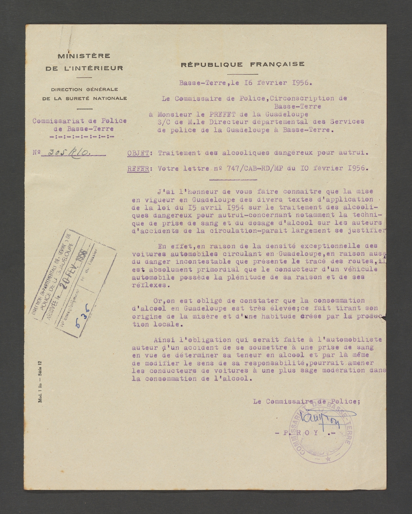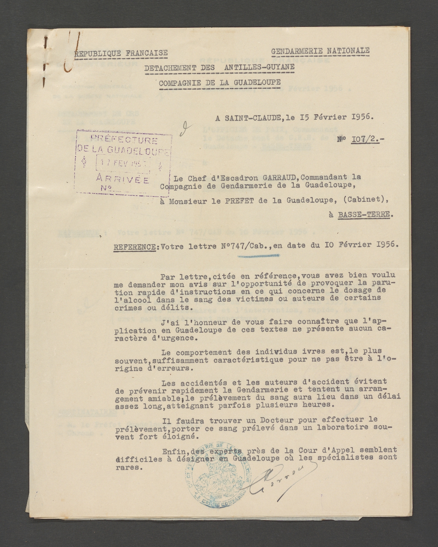 A partir de 1954, les autorités publiques, inquiètes à l’échelle nationale des ravages provoqués par les conséquences de l’alcoolisme sur la conduite automobile, prennent des mesures pour lutter contre le fléau. La loi du 15 avril 1954 est promulguée avec son cortège de décrets et d’arrêtés d’application qui s’échelonnent durant toute l’année 1955. Il s’agit surtout de mettre en place les techniques de prises de sang sur les conducteurs présumés ivres après un accident avec des modèles de fiches d’examen médical. A la Guadeloupe, dans un courrier en date du 9 janvier 1956, le directeur départemental de la santé alerte le préfet sur le fait que la nouvelle règlementation en vigueur dans l’hexagone n’est pas encore applicable dans l’île. En conséquence, le 10 février 1956, le préfet demande l’avis du chef d’escadron, commandant de la gendarmerie de Saint-Claude, de l’officier de paix, commandant le détachement des CRS, du directeur départemental des services de police à Basse-Terre. Eux-mêmes s’informent auprès de leurs subordonnés.