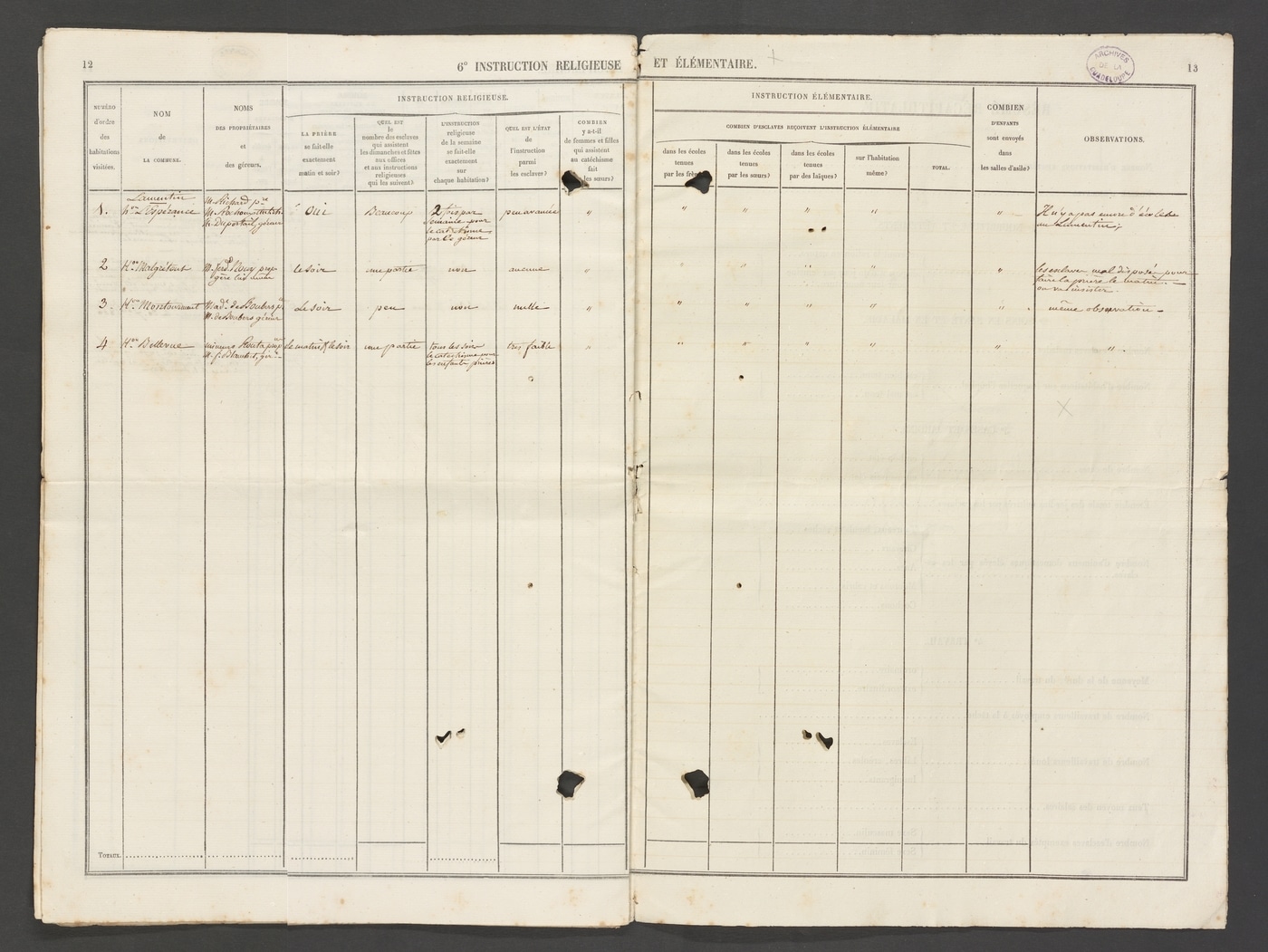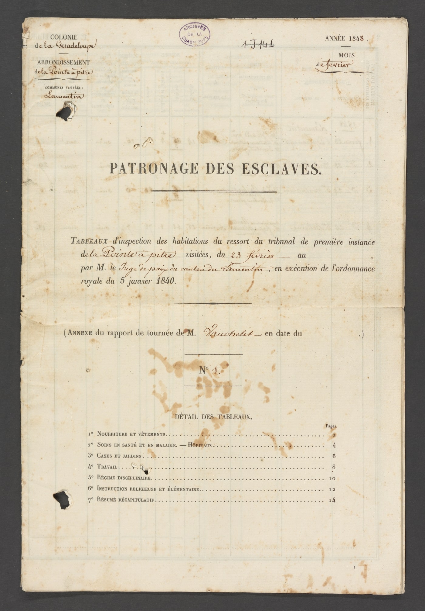 Les Archives départementales de la Guadeloupe conservent sous la cote 1 U 1 un cahier papier imprimé, complété à la main, de seize pages, intitulé : « Patronage des esclaves. Tableaux d’inspection des habitations du ressort du tribunal de première instance de la Pointe-à-Pitre visitées, du 23 février au [24 février 1848] par M. le juge de paix du canton de Lamentin, en exécution de l’ordonnance royale du 5 janvier 1840 ». Monsieur Vauchelet, juge de paix, inspecte quatre « habitations sucreries » nommées « L’Espérance, Malgrétout, Montourment et Bellevue ».