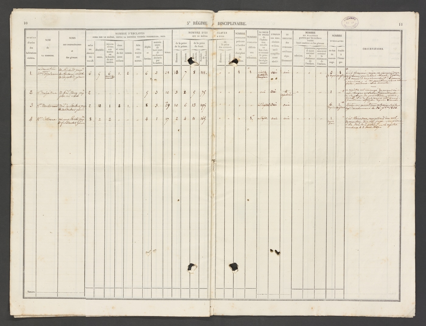 Le document permet d’appréhender les conditions de vie des esclaves et notamment les punitions qu’ils subissent. Par exemple, sur l’habitation L’Espérance, vingt-huit esclaves ont été « punis par le maître, depuis la dernière tournée d’inspection », pour l’un des motifs suivants : refus ou absence de travail, désobéissance, injures envers son maître ou la famille de son maître, ivresse, dégâts et larcins, marronnages de huit jours et au-dessous. Les peines infligées aux esclaves sont la prison et le fouet, dont le nombre de cops est précisé. Il existe également un atelier cantonal de discipline, où un esclave est enfermé lors de la visite de la sucrerie. Enfin, un esclave a été déféré au tribunal. Il s’agit du nommé François, ex-commandeur, c’est-à-dire l’esclave nommé par le maître pour conduire les autres esclaves au travail, qui a été condamné par la cour royale d’assises à deux années d’emprisonnement.