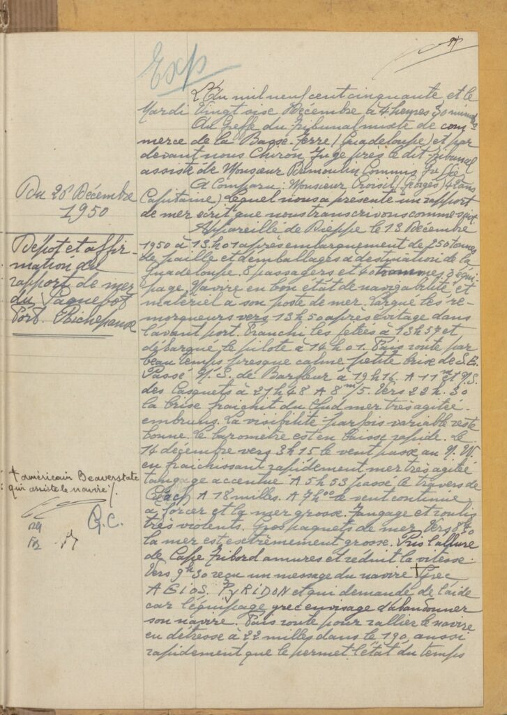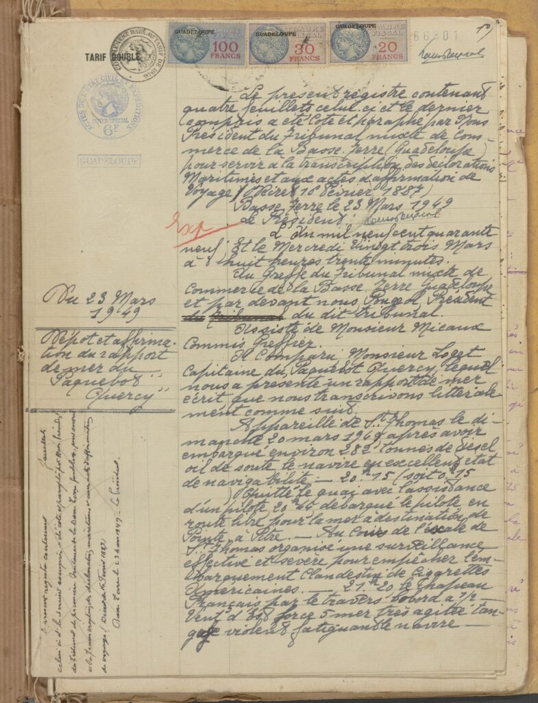 Les Archives départementales de la Guadeloupe ne conservent pour le moment que deux registres de rapports de mer pour les années 1937 à 1950. Le registre commencé le 23 mars 1949 et clos le 26 décembre 1950 contient vingt-six rapports affirmés par les capitaines des navires nommés Quercy, Caribée, Fort Duquesne, Fort Dauphin, Guadeloupe, Fort royal… qui sont une source importante pour l’histoire de la navigation.