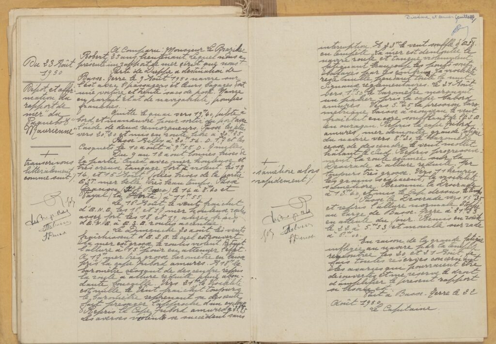 On apprend par exemple que le cargot Maurienne, en parfait état de navigabilité, part de Dieppe à destination de Basse-Terre le 9 août 1950 avec à son bord six passagers et leurs bagages, dont une voiture. Du 9 au 12 août 1950, la mer est houleuse et très creuse, le tangage fort et violent puis, du 13 au 15 août, la mer est belle. À partir du 20 août, le ciel est couvert, la mer est grosse et « le baromètre reprenant sa descente fait présager l’approche d’un cyclone ». Le lendemain, le navire passe la Désirade et reprend son allure normale puis stoppe au large de Basse-Terre. En raison de la grande fatigue infligée au bateau par la tempête, le capitaine fait toutes les réserves concernant les avaries qui pourraient être découvertes.