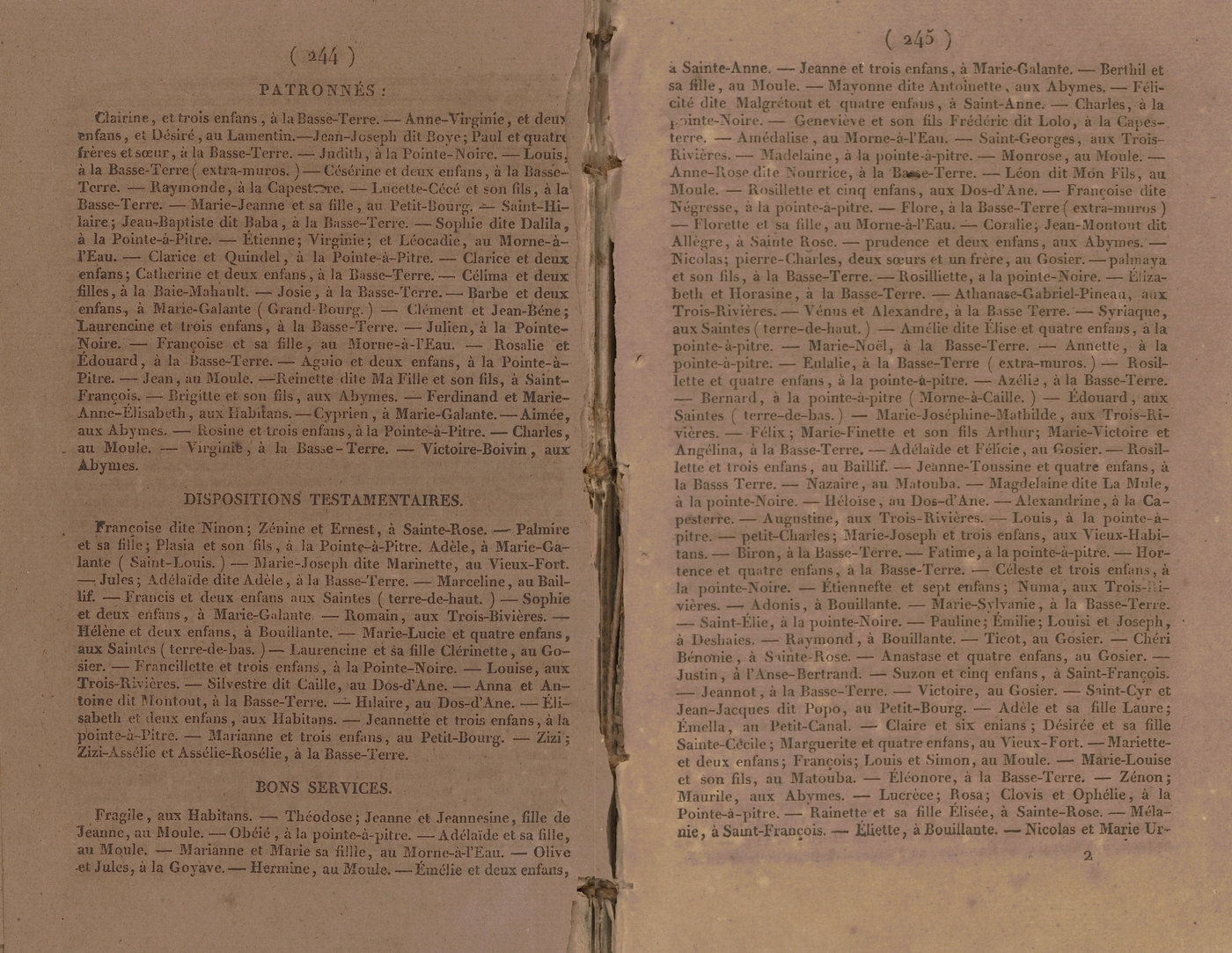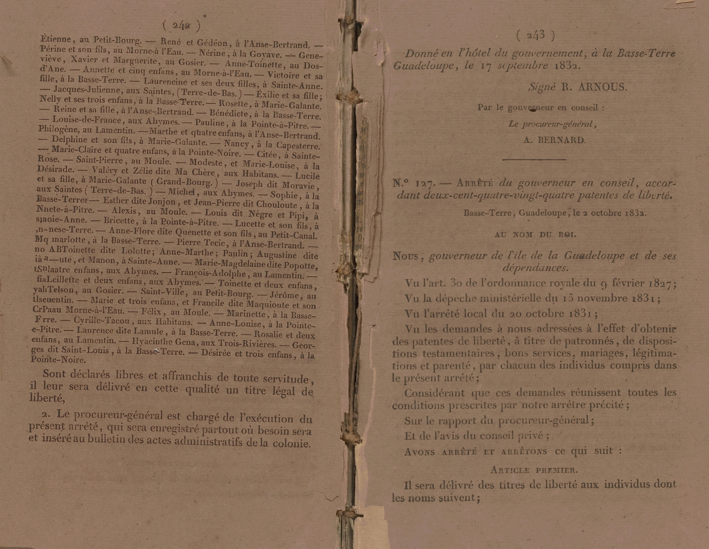 C’est le cas de l’arrêté n°127 du 2 octobre 1832, paru au Bulletin n° 10 du mois d’octobre 1832, aux pages 243 à 247, accordant 284 patentes de liberté. Notez qu’il ne mentionne pas encore l’ordonnance royale du 12 juillet 1832 mais l’ordonnance royale du 9 février 1827, la dépêche ministérielle du 15 novembre 1831, un arrêté local du 20 octobre 1831. Il résulte des demandes d’obtention des «patentes de liberté», «à titre de patronnés, de dispositions testamentaires, bons services, mariages, légitimations et parenté des individus compris dans le présent arrêté».