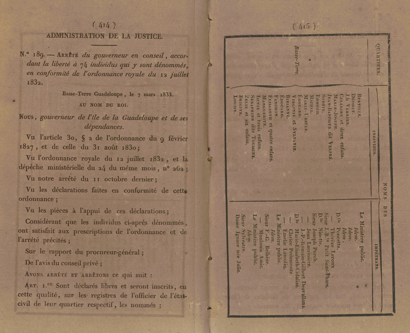 Il en est de même pour l’arrêté du gouverneur en conseil n°189 du 7 mars 1833, paru au Bulletin n° 15 du mois de mars 1833, aux pages 414 à 417, «accordant la liberté à 74 individus qui y sont dénommés, en conformité de l’ordonnance royale du 12 juillet 1832». Déclarés libres et seront inscrits dans le registre de l’état-civil.