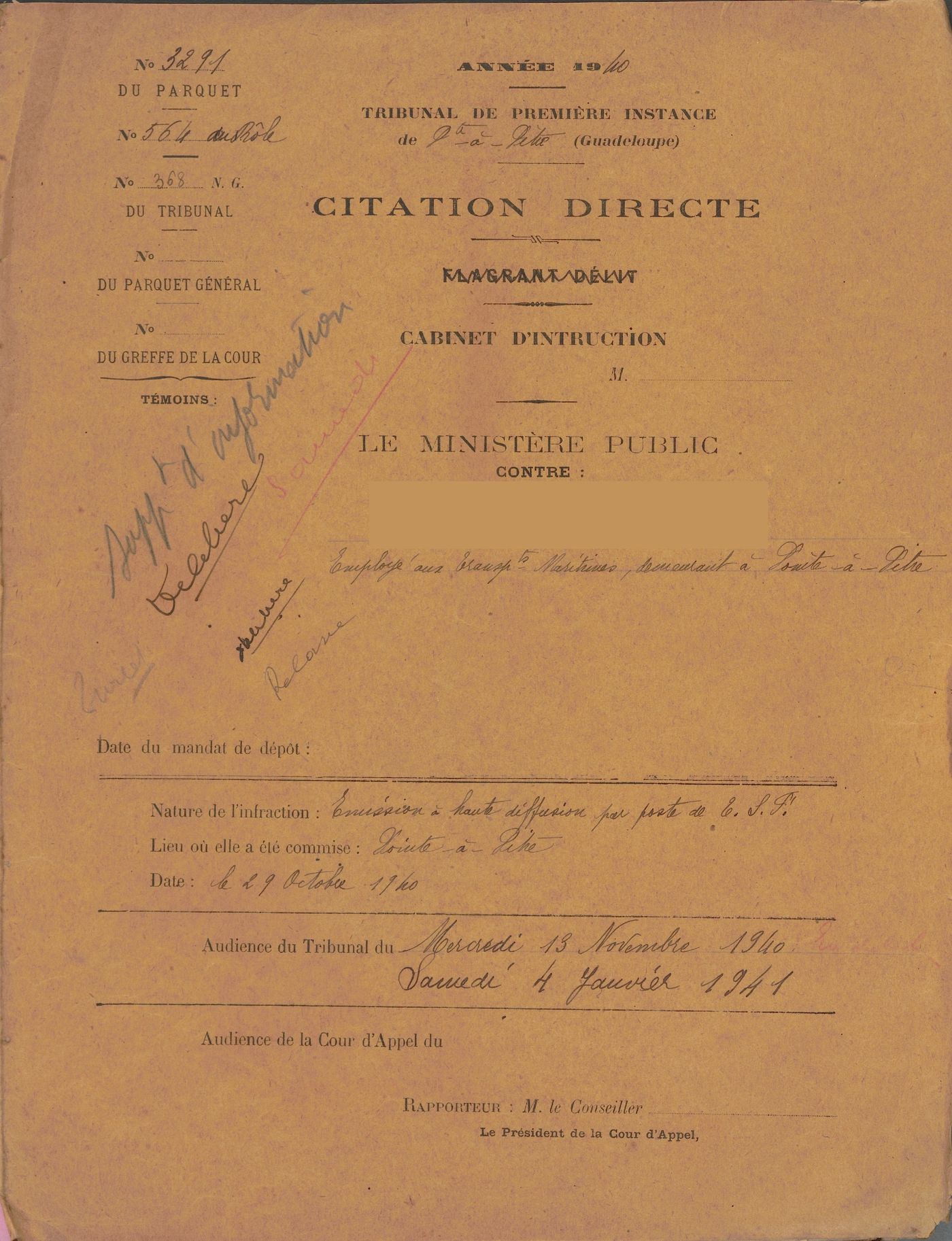 Tribunal de première instance de Pointe-à-Pitre. Dossiers de procédure pénale, Arch. dép. Guadeloupe, 3 U 2 /46.