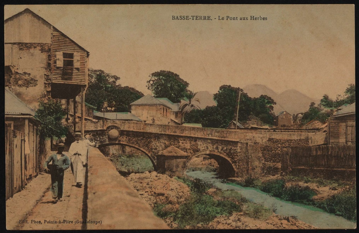 Cette carte postale représente le pont de la rivière aux Herbes un monument emblématique de la commune de Basse-Terre, chef-lieu de la Guadeloupe. Le cliché a été réalisé par le photographe et éditeur Edgar Litté au début du XXe siècle qui signait sous le nom de « Phos ». Après la Première Guerre mondiale, les clichés du photographe ont été repris par l’éditeur de cartes guadeloupéen « Boisel ».