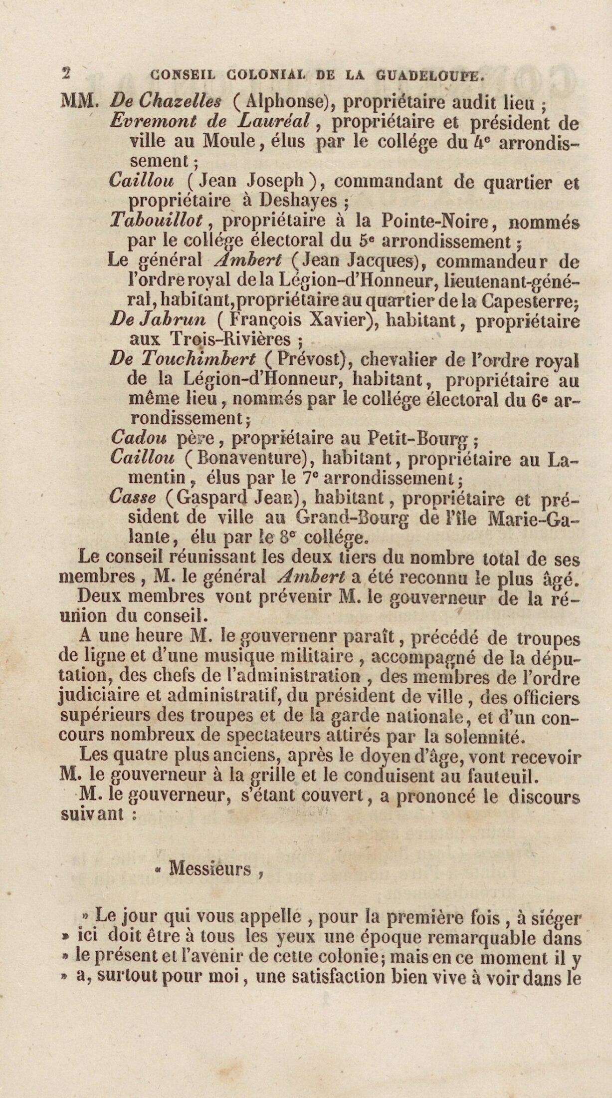 Le 6 janvier 1834 à Basse-Terre, après une messe célébrée par le préfet apostolique en l’église Saint-François, les membres du conseil colonial, la première représentation locale élue en 1833 au suffrage censitaire, se réunissent à l’hôtel du Petit-Gouvernement pour tenir leur session inaugurale. Le lendemain, par 15 voix sur 21 votants, ils choisissent à bulletin secret leur premier président, le général Jean-Jacques d’Ambert. Agé de 69 ans, Ambert est le doyen d’âge de l’assemblée ; après une carrière militaire brillante sous la Révolution, il commande un temps les troupes stationnées à la Guadeloupe où il est également par sa femme un riche propriétaire terrien. A cette époque, le président est renouvelé chaque année et le général d’Ambert préside l’assemblée à plusieurs reprises jusqu’en 1848, et notamment en 1847 quand le conseil colonial se prononce en faveur d’une abolition sous condition de l’esclavage. Il meurt à Saint-Claude le 20 novembre 1851.
