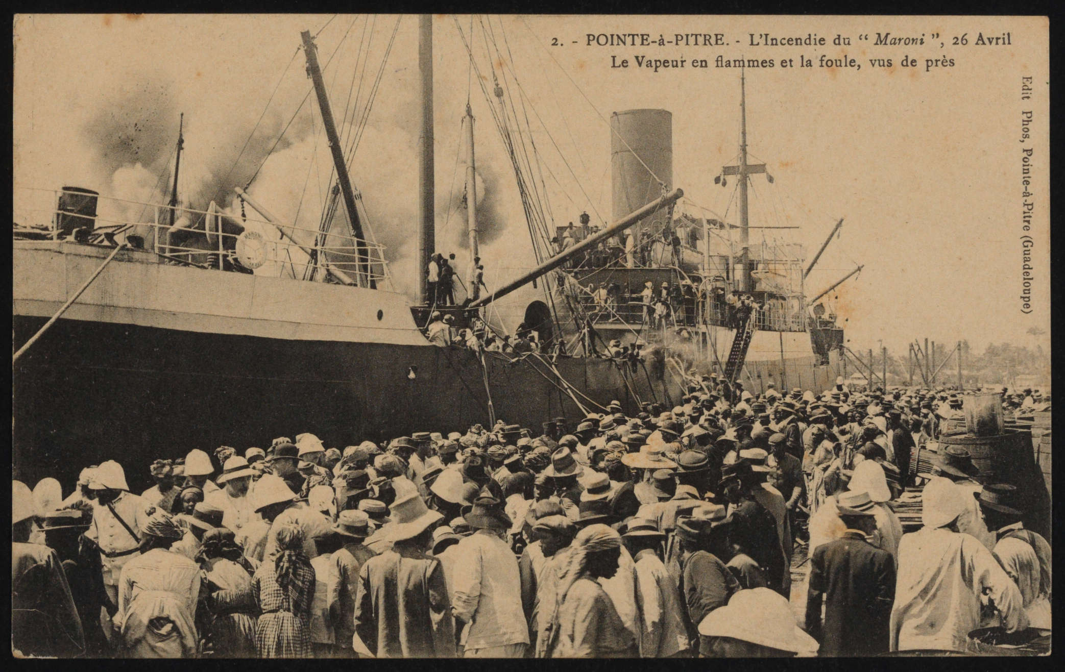 Il y a presque 112 ans jour pour jour, un fait divers sur les quais de Pointe-à-Pitre retient l’attention. Le 26 avril 1911, le cargo Maroni de la Compagnie générale transatlantique prend feu alors qu’il est à quai. La foule accourt, les photographes également, à commencer par le plus connu d’entre eux, Edgar Littée surnommé Phos (1866-1931). En un rien de temps, les clichés qu’il prend de la catastrophe sont édités en cartes postes et mises en vente dès les jours qui suivent.