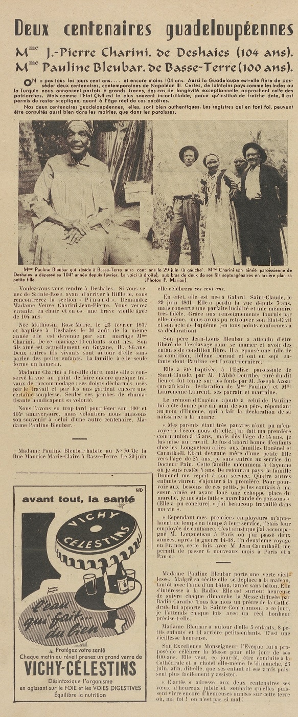 En 1961, le journal « Clartés », à la page 4 de son numéro 769 du 3 juin, célèbre deux centenaires guadeloupéennes : l’une a 104 ans, originaire de Deshaies, elle est née en février 1857, l’autre centenaire, originaire de Saint-Claude, qui a presque 100 ans, est née en juin 1861.