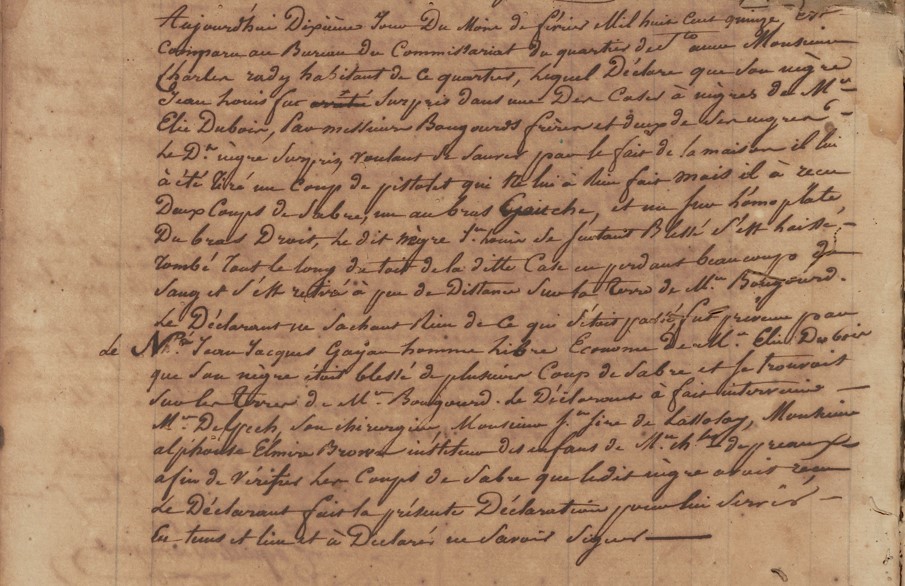 Aujourd’hui dixième jour du mois de février mil huit cent quinze, est comparu au bureau du commissariat du quartier de Sainte-Anne Monsieur Charles Rady, habitant de ce quartier, lequel déclare que son nègre Jean-Louis surpris dans une des cases à nègres de M. Elie Dubois par messieurs Bougourd frères et deux de ses [mis pour leur] nègres. Ledi nègre, surpris, voulant se sauver par le faîte de la maison, il lui a été tiré un coup de pistolet qui ne lui a rien fait mais il a reçu deux coups de sabre, un au bras gauche et un sur l’omoplate du bras droit ; ledit nègre Jean-Louis se sentant blessé s’est laissé tomber tout le long du toit de ladite case en perdant beaucoup de sang et s’est retiré à peu de distance sur la terre de M. Bougourd. Le déclarant ne sachant rien de ce qui s’était passé, fut prévenu par le nommé Jean-Jacques Gayan, homme libre, économe de M. Elie Dubois, que son son nègre était blessé de plusieurs coups de sabre et se trouvait sur les terres de M. Bougourd. Le déclarant a fait intervenir M. Delpech son chirurgien, Monsieur Jean-Pierre de Lassosay, Monsieur Alphonse Emlire Brown, instituteur des enfants de M. Charles de Préaux, afin de vérifier les coups de sabre que ledit nègre avait reçus ; Le déclarant fait la présente déclaration pour lui servir en temps et lieu et a déclaré ne savoir signer