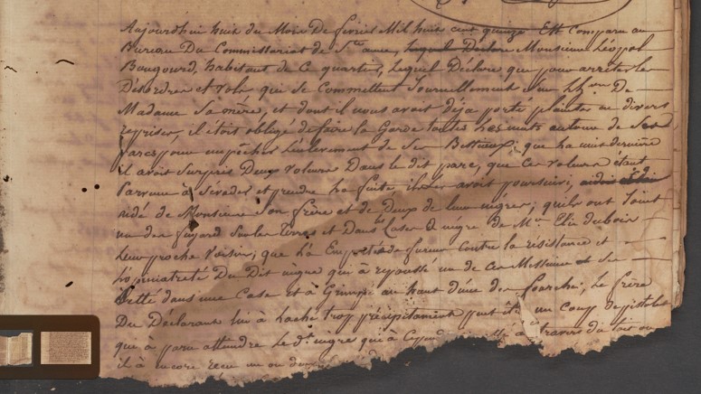 Aujourd’hui 8 du mois de février mil huit cent quinze, est comparu au bureau du commissariat du quartier de Sainte-Anne Monsieur Léopold Bougourd, habitant de ce quartier, lequel déclare que pour arrêter les désordres et vols qui se commettent journellement sur l’habitation de Madame sa mère et dont il nous avait déjà porté plainte à diverses reprises, il était obligé de faire la garde toutes les nuits autour de ses parcs pour empêcher l’enlèvement de ses bestiaux, que la nuit dernière il avait surpris deux voleurs dans ledit parc, que ces voleur étant parvenus à s’évader et prendre la fuite, il les avait poursuivis aidé de Monsieur son frère et de deux de leurs nègre ; qu’ils ont joint un des fuyards sur les terres et dans les cases à nègres de M. Elie Dubois leur proche voisin ; que là, emporté de fureur contre la résistance et l’opiniâtreté dudit nègre, qui a repoussé  l’un de ces messieurs et s’est jeté dans une case et a grimpé en haut d’une des fourches ; le frère du déclarant, lui a lâché, trop précipitamment peut-être, un coup de pistolet qui a paru atteindre ledit nègre qui a cependant passé au travers du toit où il a encore reçu un ou deux coups de [sabre]… nous fait la présente déclaration [afin] de se prémunir contre les [poursuites] qu’on serait peut-être [enclins à lancer contre son frère et lui pour une action] si naturelle et a signé