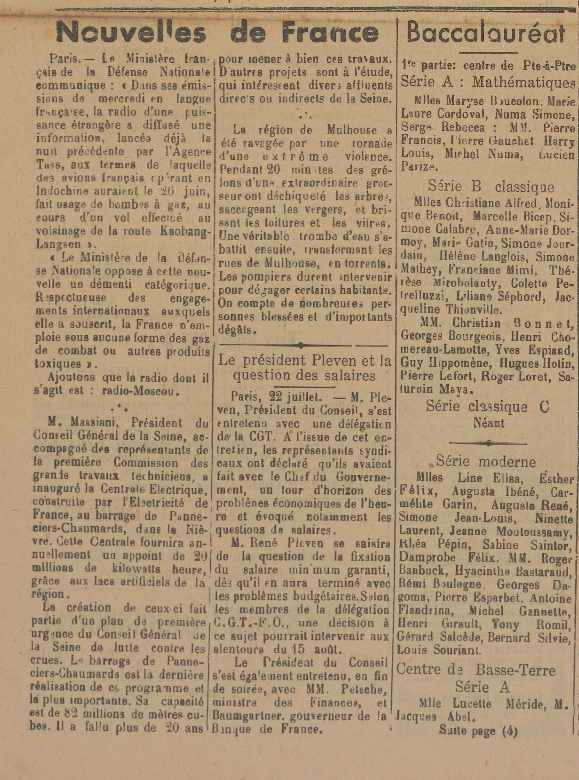 Ils s’appellent Maryse, Michel, Lucien, Hyacinthe, Marcelle, Christian, Georges, Colette, Henri, Jeanne, Félix, Roger, Gérard, Cécile, Madely… Soixante-trois lauréats obtiennent la première partie du baccalauréat en 1950, pour le centre d’examen de Pointe-à-Pitre : en série A , Mathématiques (9), série B : classique (23), série moderne (23), série classique C (néant) et pour le centre d’examen de Basse-Terre : en série A (2) , série classique B (5), série classique C (1). Comme chaque année à cette époque, ces résultats sont publiés dans le journal Le Nouvelliste : quotidien de la Guadeloupe n° 7519 du lundi 24 juillet 1950. Que sont-ils devenus ? Ecrivain, journaliste, médecin, professeur, athlète, plusieurs  sont connus du public pour avoir marqué l’histoire de la société guadeloupéenne.