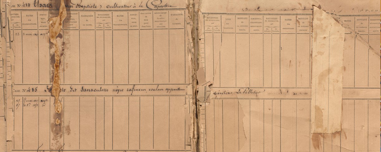 Le relevé de formalités présenté aujourd’hui est singulier. Il concerne en effet un nommé Joseph dit Sans Culotte, qui achète une parcelle en 1847 et qui est par ailleurs un esclave, travaillant sur une habitation sucrière. Même si les lois « Mackau » de 1845 permettent en théorie aux esclaves d’accéder à la propriété sous la curatelle de leurs maîtres, il est exceptionnel de trouver de telles transactions dans des relevés de formalités.