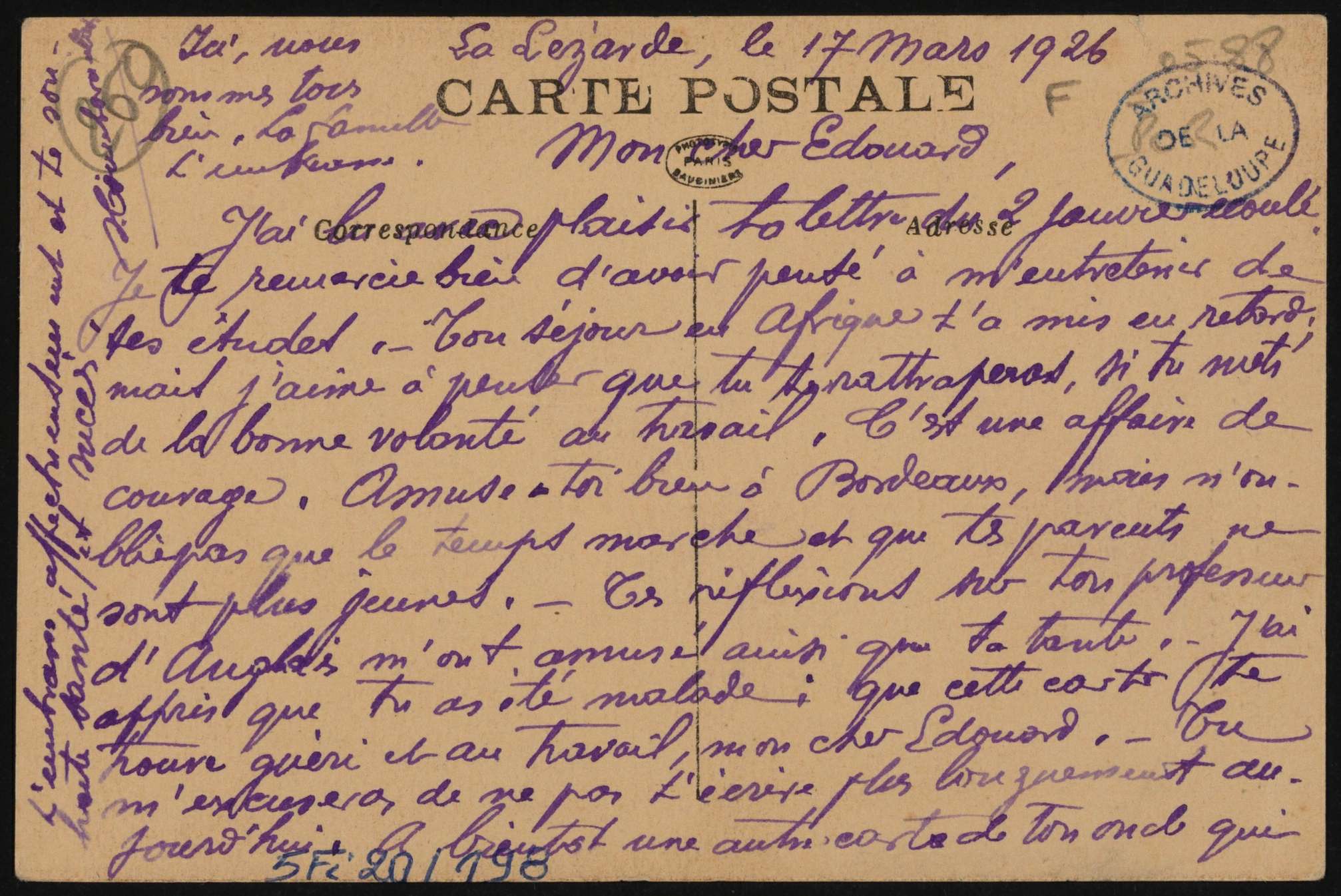 Utilisée en  1926,  cette carte nous plonge dans l’intimité d’un échange entre un oncle et son neveu, issus d’une famille manifestement aisée.  L’oncle réside à la Lézarde à Petit-Bourg,  il répond au courrier reçu de son neveu qui est à Bordeaux. Le ton est affectueux mais pressant ! Edouard semble s’être mis à voyager au détriment de ses études, notamment en Afrique et il « s’amuse » maintenant à Bordeaux. L’oncle utilise une carte postale pour lui faire passer quelques vérités. Avec un certain sens de la diplomatie, il rappelle le jeune homme à ses devoirs. Le ton est d’abord sarcastique : «Je te remercie d’avoir pensé à m’entretenir de tes études ». Puis il insiste, « la bonne volonté qu’il faut pour se remettre au travail… le courage… le temps marche et les parents ne sont plus jeunes ». Et enfin, il enfonce le clou : « Que cette  carte te trouve guéri et au travail ». Nul ne sait si Edouard a suivi les sages conseils de son oncle ni ce qu’il est devenu, laissant ainsi la place à notre imagination !