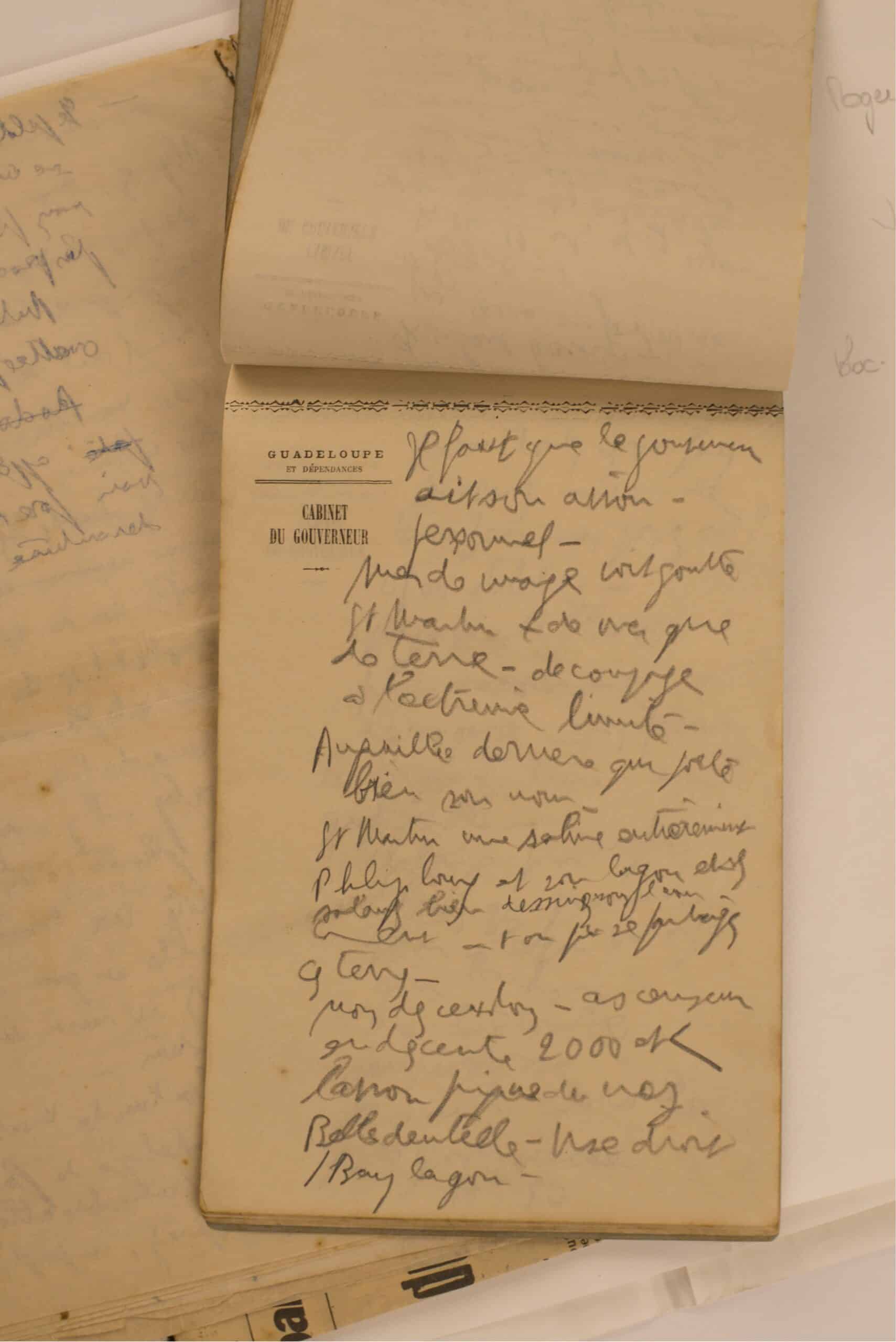 Mais pour ce qui nous intéresse aujourd’hui, la série Fi rassemble les archives visuelles comme les photographies, les affiches, les cartes postales, ainsi cette collection d’étiquettes de bouteilles de rhum donnée par un collectionneur (10 Fi) ; ou encore, la série J qui contient des archives d’origine privée, provenant de particuliers, d’entreprises, d’associations etc., comme le fonds 7 J Roger Fortuné, d’où est issu ce petit carnet de notes évoquant la première ligne aérienne entre Basse-Terre et Saint -Martin.