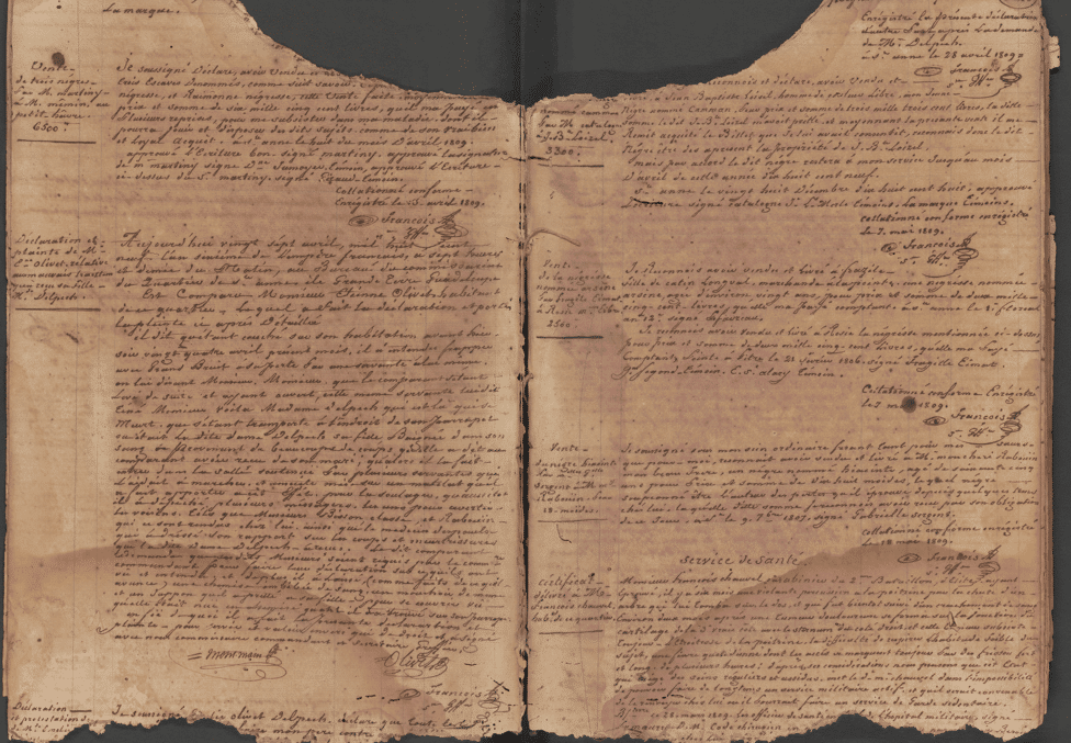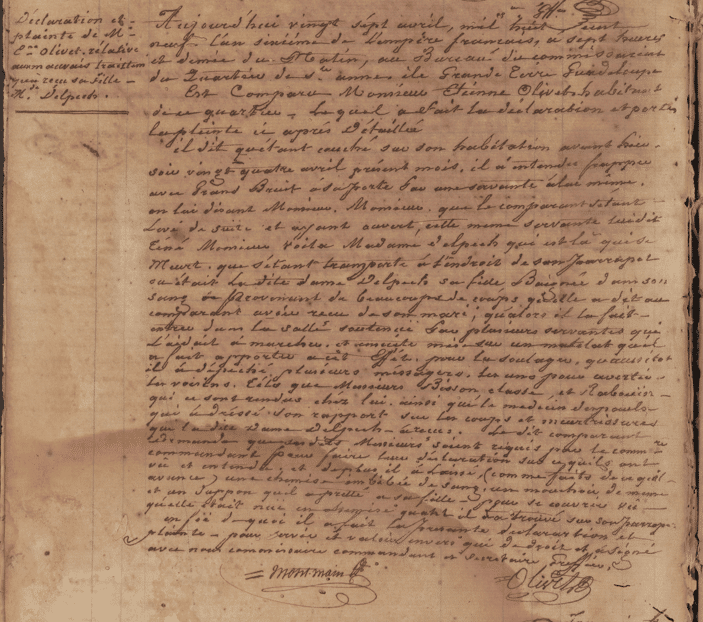 Emilie est la fille unique d’Etienne Olivet, un propriétaire terrien qui habite le quartier de Sainte-Anne au nord-est de la Grande-Terre. Elle a épousé un autre propriétaire terrien, nommé Delpech. L’affaire commence en 1809 et elle nous est connue grâce au Registre des déclarations du bureau du commandant de Sainte-Anne, île Grande Terre, Guadeloupe. Sur ce registre, sont consignés au jour le jour les déclarations, plaintes et autres signalements effectués par les habitants du quartier de Sainte-Anne auprès de leur commissaire et de son greffier.
