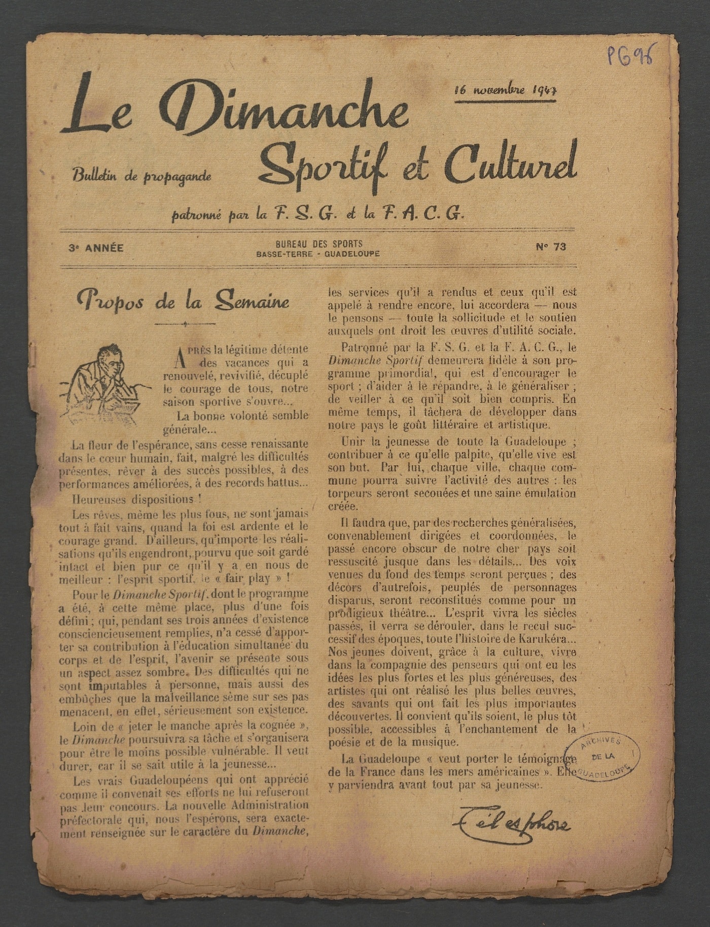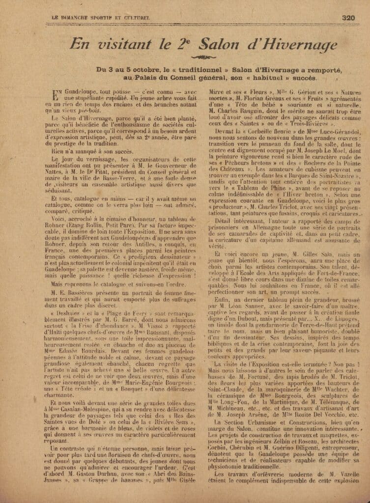 Venez visiter le 2e salon d’Hivernage, manifestation artistique qui s’est tenue du 3 au 5 octobre 1947 au Palais du Conseil général. Une immersion possible grâce au n° 73 du bulletin paru le 16 novembre 1947, «Le Dimanche sportif et culturel», bulletin de propagande patronné par la F.S.G. (Fédération sportive de la Guadeloupe) et la F.A.C.G.(Fédération des associations culturelles de la Guadeloupe). L’article s’intitule «En visitant le 2e salon d’Hivernage». A l’époque, cette exposition d’art a eu du succès auprès du public comme ce fut le cas du premier salon d’hivernage organisé en 1946. L’intérêt de cet article émane de la plume du narrateur, un nommé Lebrun, peintre en bâtiments de profession qui se fait critique d’art le temps d’un article : il nous fait part de ses impressions sur l’exposition, nous donne les noms des participants, artistes, artisans, ingénieurs ainsi que leurs œuvres d’art à partir du catalogue de l’exposition. Sept disciplines réparties en sept sections sont présentées : section I – la peinture et le dessin ; section II – Sculpture et plastique ; section III – Céramique ; section IV – artisanat ; section V – Urbanisme et constructions ; section VI – Présentation florale ; section VII – Orfèvrerie. Le programme est bien fourni mais on notera cependant l’absence de la photographie dans un âge où les photographes ne manquent pourtant pas.