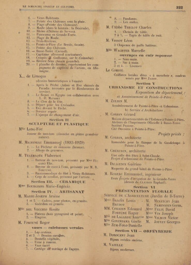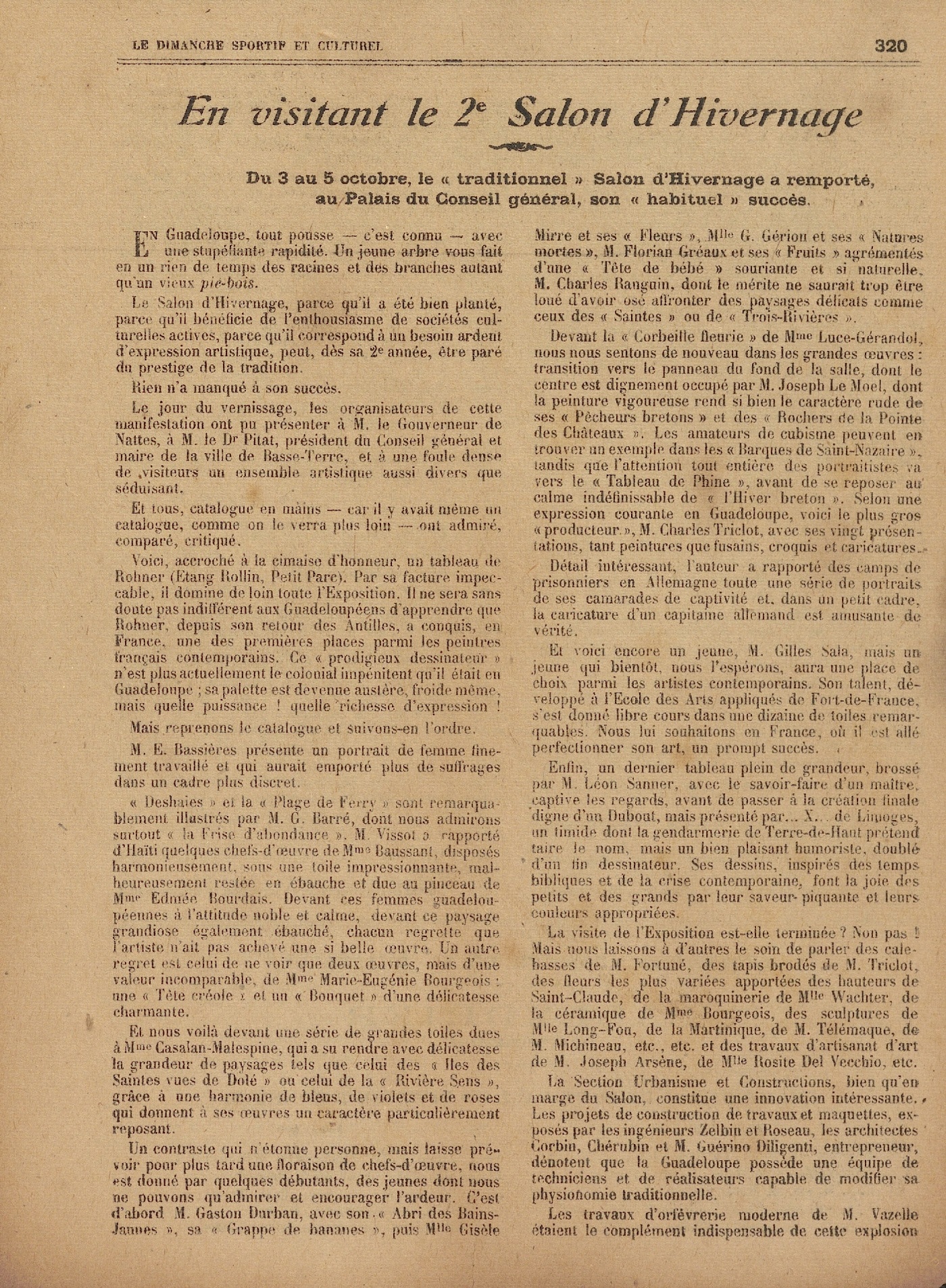 C’est ainsi que les noms cités ci-après vous évoqueront sûrement un souvenir : les peintres : Barré G., Casalan Malespine, Le Moel, M. Durban Gaston, Gréaux Florian, Rohner (L’Etang Rollin du Petit Parc), Sala Gilles, l’Abbé Triclot Charles; les sculpteurs : Long-Fou, Michineau Emmanuel, Télémaque Flabernot; les artisans : Mme Bourgeois Marie-Eugénie, Marie-Joseph Arsène, Fortuné Roger ; les architectes : Zeblin M., Corbin Gérard, Chérubin, Diligenti Guérino, Roseau Emmanuel; la présentation florale : Bradin Louis, Baudot, Coradin Edouard, Fortuné Roger, Minatchy Jean, Saminadin Germ., Félix David, Jouvet Georges ; l’orfèvrerie : Dorocant Jean, Vazelle. Pour vous imprégner de l’at mosphère du salon vous pourrez également consulter aux Archives départementales de la Guadeloupe, l’article de «La Revue guadeloupéenne» de novembre-décembre 1947, cote PG 3 ou bien les documents réunis par Roger Fortuné, il s’agit de documents portant sur «Les expositions diverses en Guadeloupe», ayant la cote 7 J 31. Vous y trouverez de la correspondance, le catalogue du IXe salon d’hivernage du 23 décembre 1965 – 3 janvier 1966. « Le Dimanche sportif et culturel : bulletin de propagande patronné par la F.S.G et la F.A.C.G», n° 73, 16 novembre 1947.