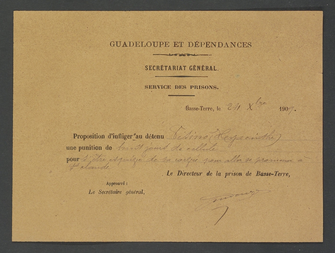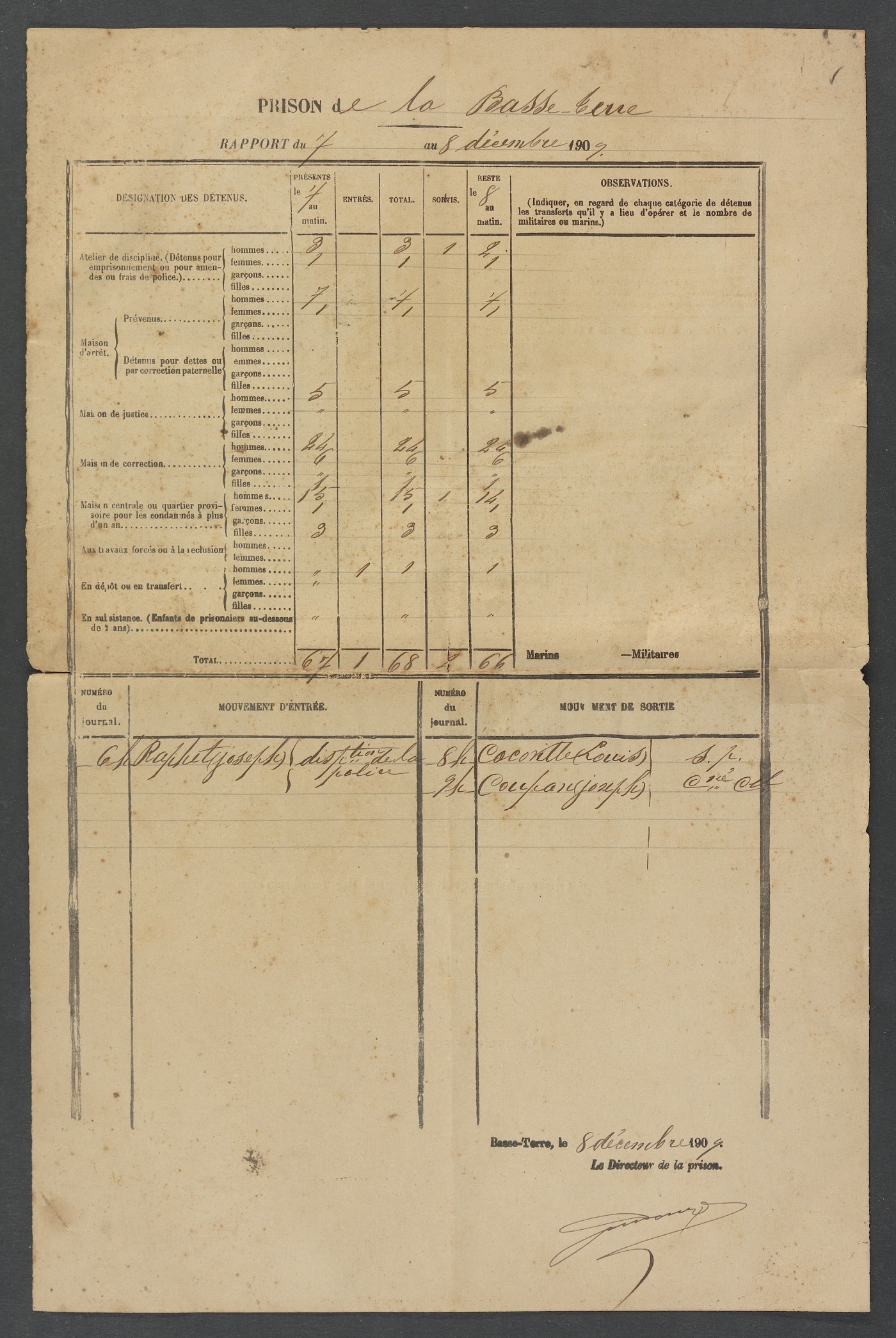 Prison de Basse-Terre, rapports journaliers, décembre 1909. Arch. dép. Guadeloupe, INC 126/2.