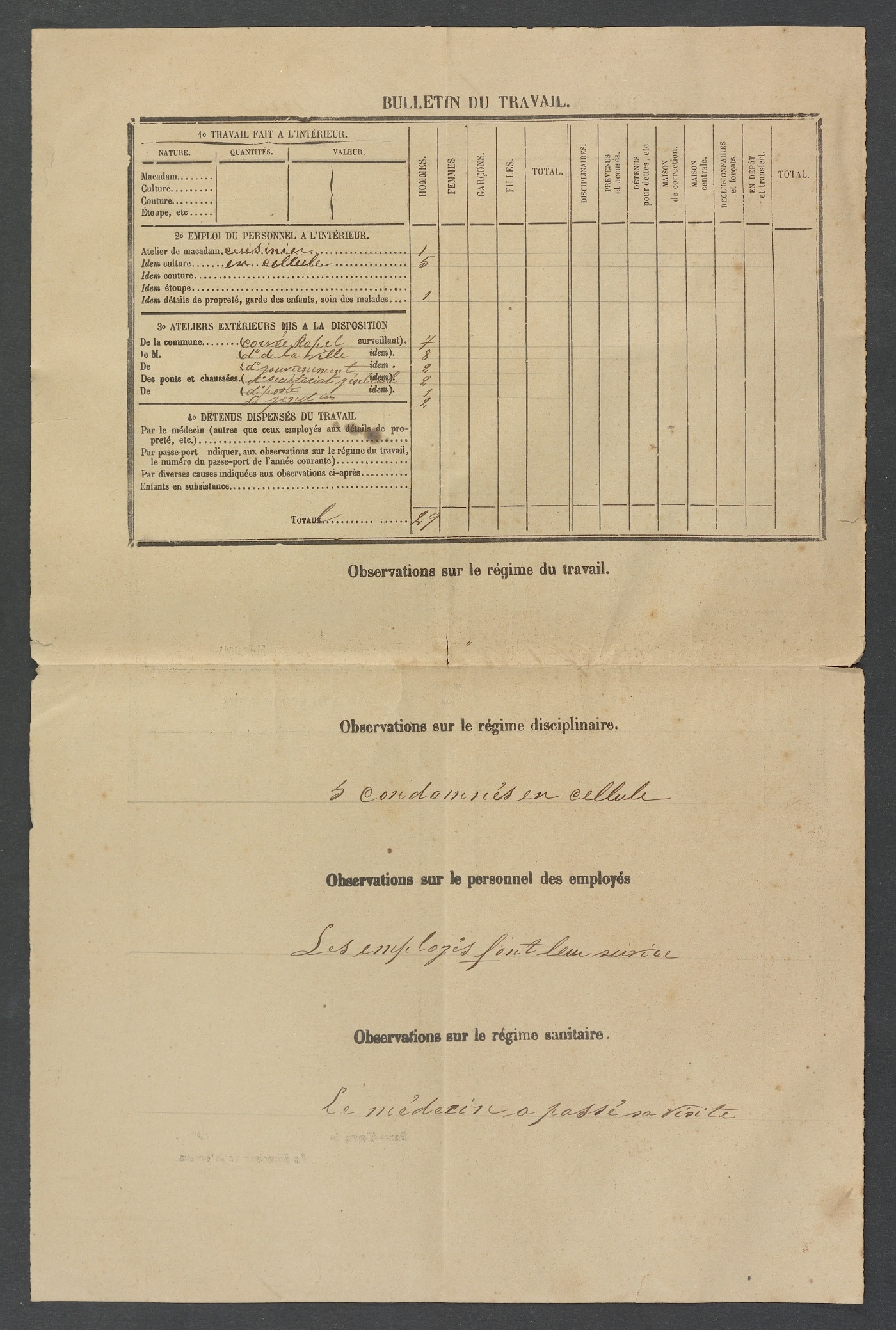 Nous vous présentons aujourd’hui le rapport journalier du 7 au 8 décembre 1909. On y voit que la prison héberge 50 hommes et 17 femmes soumis à des corvées à l’intérieur de la prison ou à l’extérieur. Les prisonniers sont souvent mis à la disposition des mairies ou du service des ponts et chaussées. La surveillance des détenus présente parfois quelques failles, comme en témoigne le billet où l’on apprend qu’Hyacinthe Visino, un jeune homme de 24 ans, s’est esquivé pour aller se promener à Saint-Claude dont il est originaire et où son père y est charpentier. Il est condamné à huit jours de cellule, c’est-à-dire à dire placé à l’isolement pour huit jours.