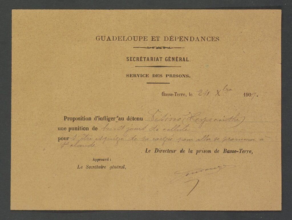 Il est vrai que les archives relatives aux prisons au XIX e et début du XX e siècles sont rares en raison principalement de la création tardive des Archives départementales à la Guadeloupe, du cyclone de 1928, de l’incendie de 1955 qui détruisit en partie le service.