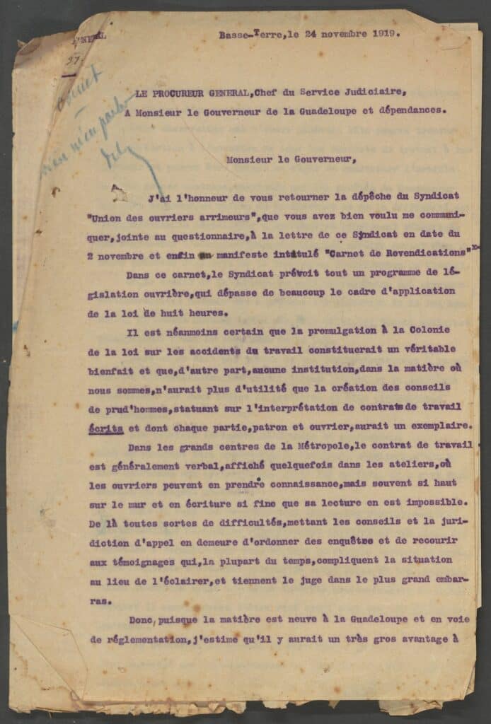 Dossier « Loi des huit heures », cabinet du Gouverneur, 1919. Arch. dép. Guadeloupe, INC 1282.