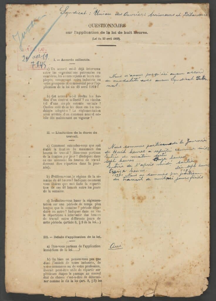 Le 23 avril 1919, le Parlement adopte la « Loi des huit heures » qui consacre la limitation du temps de travail à 8 heures par jour sans perte de salaire. Avancée sociale majeure, son champ d’action est cependant circonscrit et sa mise en œuvre doit répondre à une méthodologie précise. Un dossier provenant du Cabinet du Gouverneur, nous en apprend plus au sujet de la mise en œuvre de cette loi à la Guadeloupe.
