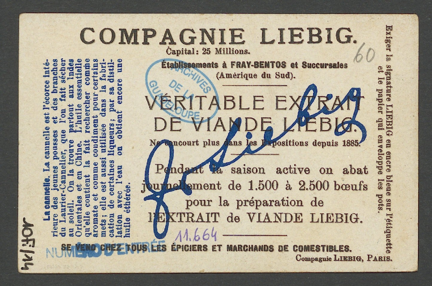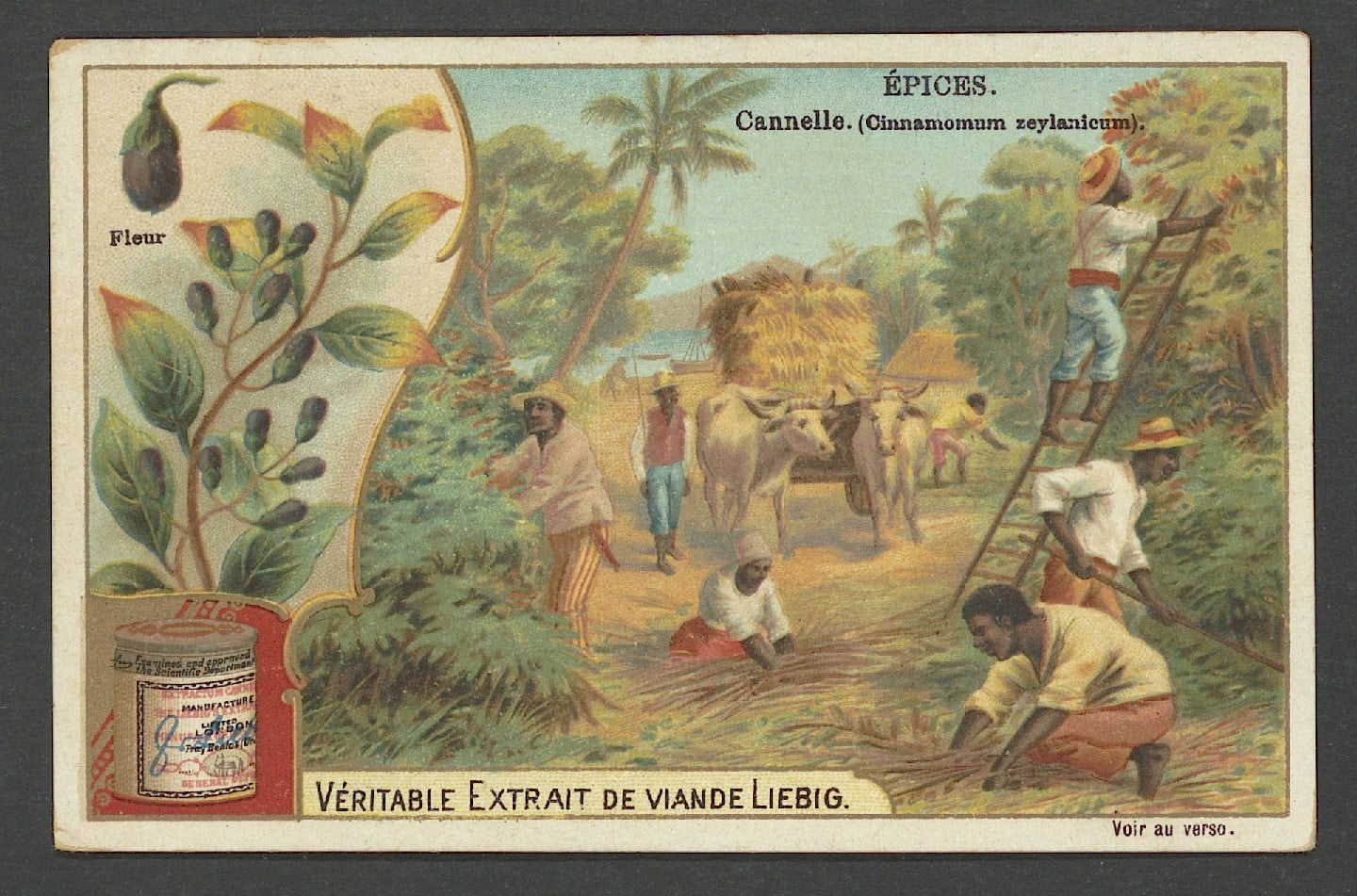 Le chromo qui a retenu notre attention est édité par l’entreprise « Liebig », une entreprise créée en 1843 qui vend de l’extrait de viande, un exhausteur de goût. Cette entreprise existe toujours et vend aujourd’hui des soupes. Sur le recto du chromo figure une scène idéalisée de la vie agricole aux Antilles où six ouvriers sont en train de récolter de la cannelle dans les arbres et du fourrage au sol. Comme bien souvent, les chromos sont illustrés de sujets variés à portée humoristique ou pédagogique, comme des scènes de vie quotidienne, des contes, des sujets historiques ou géographiques etc. Ici, la scène est accompagnée d’un petit médaillon où figure une conserve d’extrait de viande de la marque, rappelant le caractère publicitaire de la carte. Au verso, un dessin d’une branche de cannelle et un texte qui présente les lieux de culture et comment la consommer.