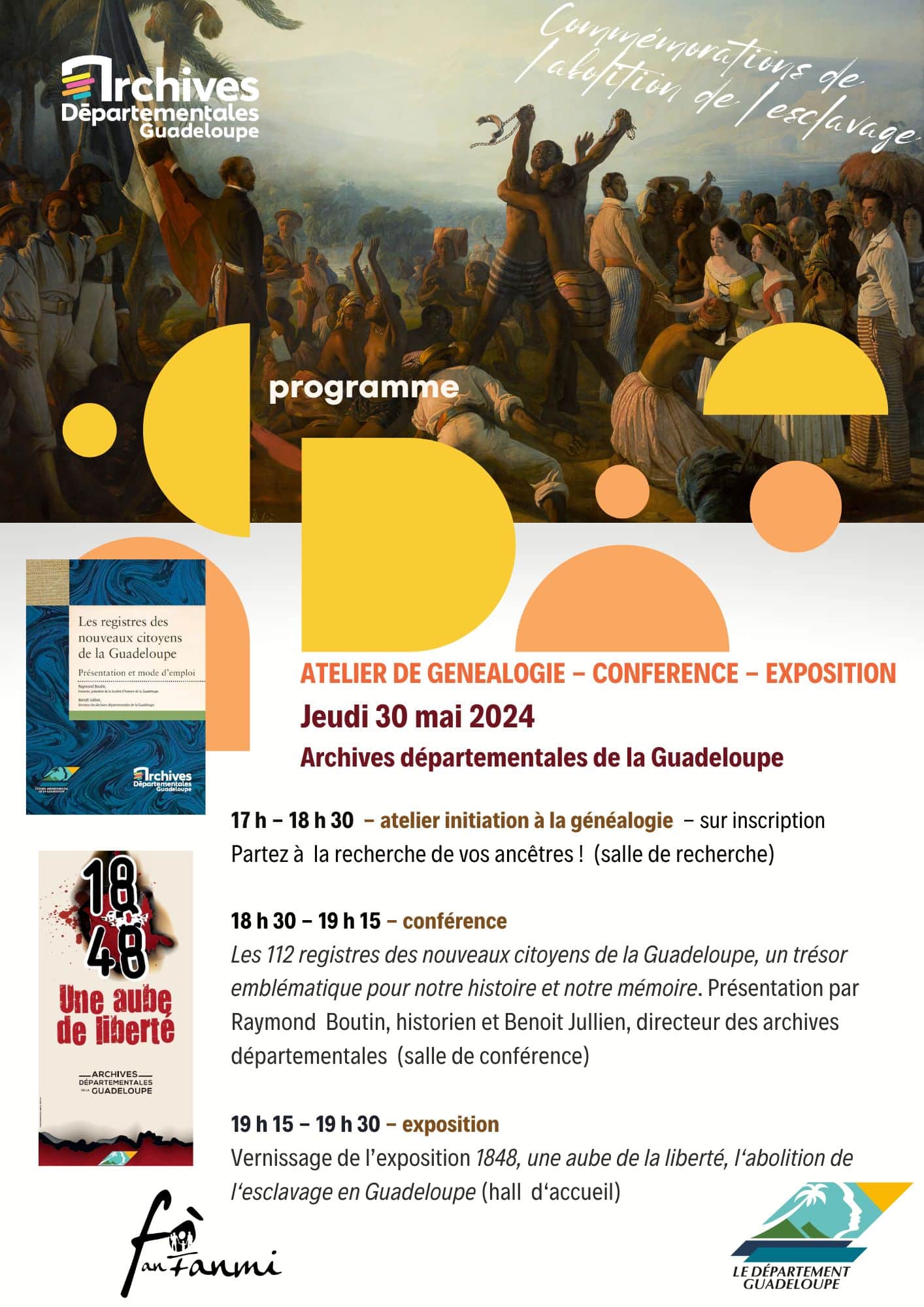 Dans le cadre des « Journées mémorielles de la liberté du Conseil Départemental de la Guadeloupe » nous avons plaisir de vous inviter à notre soirée de commémoration de l’abolition de l’esclavage le jeudi 30 mai à 18h30 dont voici le programme.