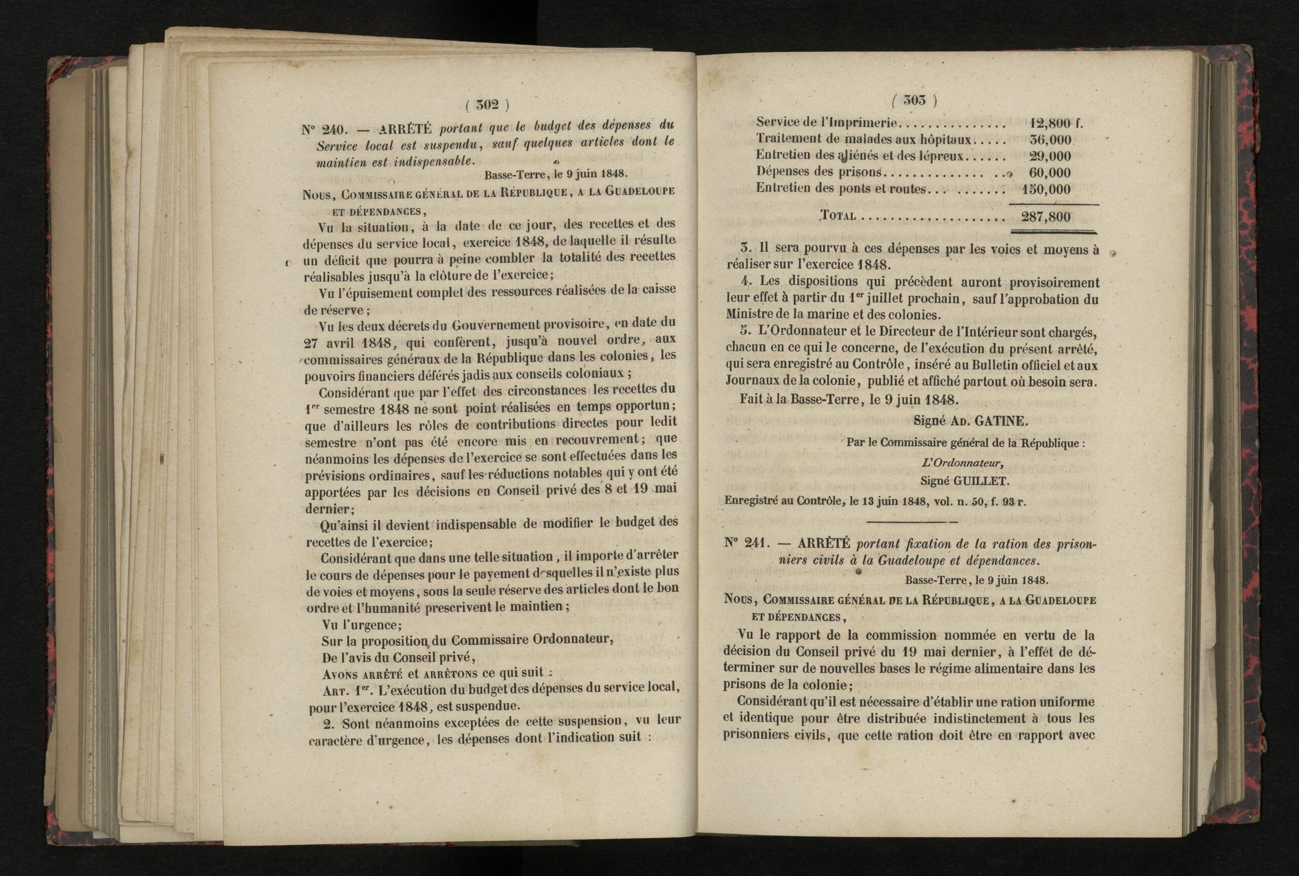 Le « Bulletin officiel de la Guadeloupe » est une mine d’informations sur la vie administrative de la Colonie, un fonctionnement administratif qui impacte parfois directement de la vie des individus. C’est ainsi qu’à la page 303 du « Bulletin officiel de la Guadeloupe » de l’année 1848, coté 3 K 1 /21 aux Archives départementales, nous trouvons l’arrêté numéro 241 du Commissaire général de la République qui fixe la ration quotidienne des prisonniers civils dans les prisons de la Guadeloupe et de ses dépendances.