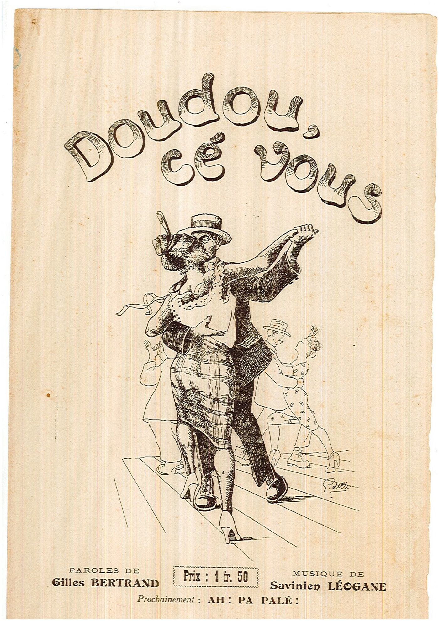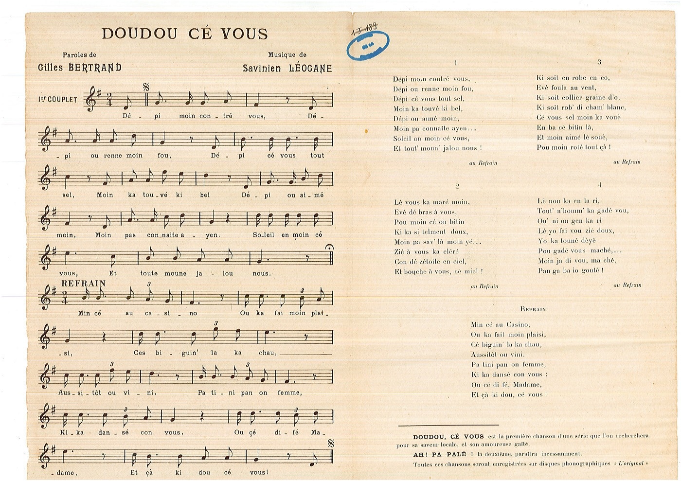 Cette partition de « Doudou cé vous » se présente sous la forme d’un cahier de quatre pages. La couverture est illustrée d’un dessin (couples de danseurs) qui invitent à la biguine avec en page centrale, les notes de musique et les paroles permettant de fredonner avec facilité la chanson. Au dos, les encarts publicitaires ont probablement permis à l’époque de financer les coûts d’impression et nous offrent aujourd’hui des informations historiques sur les commerces de Pointe-à-Pitre.