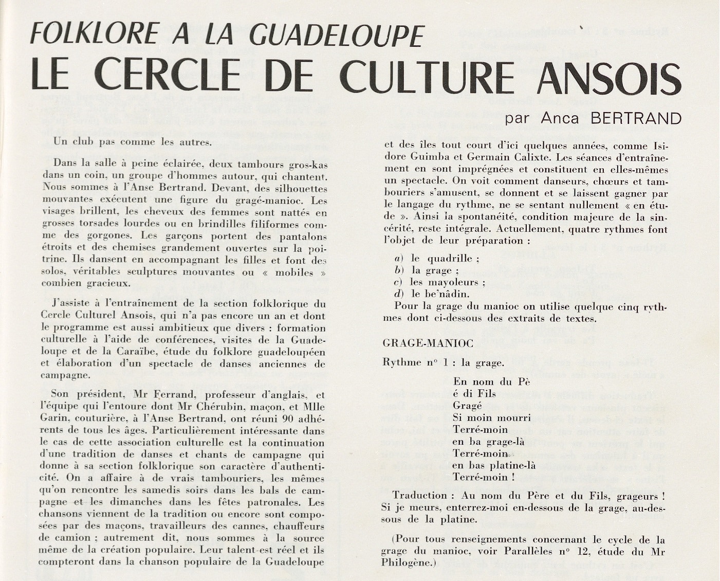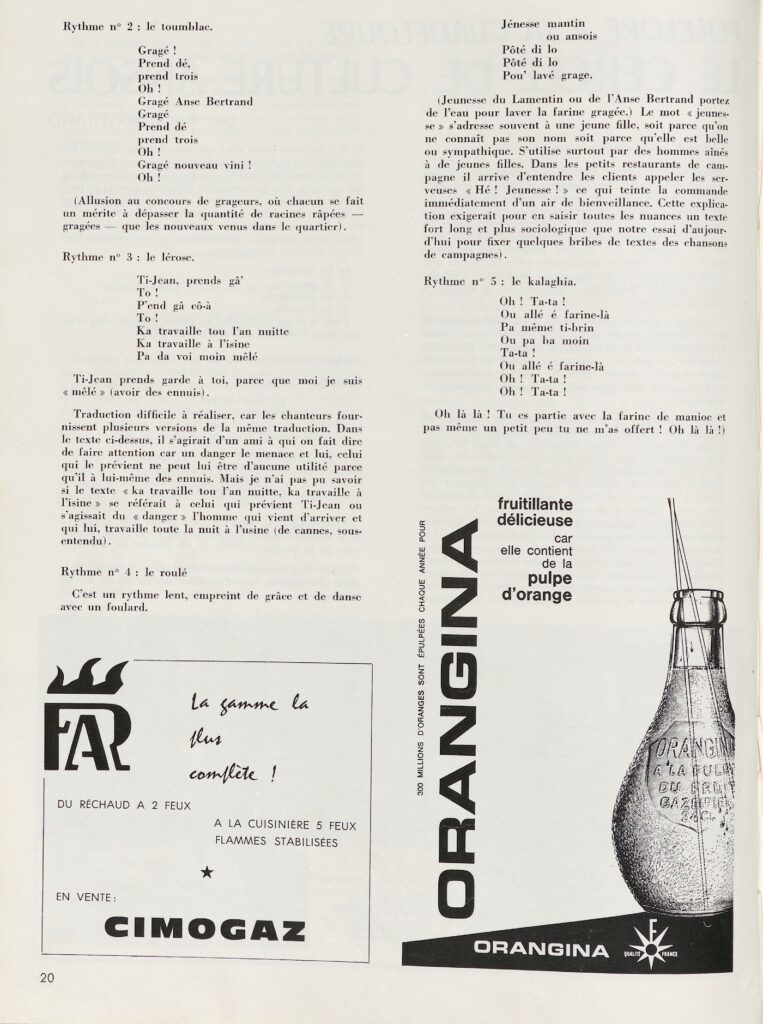 Un premier article de Francis Hilaire est intitulé « Le groupe Gros Cas à Bouillante » (1965, n° 6).  Un second article d’Anca Bertrand (1966, n°14) est intitulé « Le Cercle de culture ansois à Anse-Bertrand ». On y découvre les  différents rythmes de gwo ka tels la grage, le toumblac, le lérose, le roulé, le kalaghia ainsi que des textes en créole et traduits en français, de chansons de mayoleurs ou de bernardin (lutte aux bras).