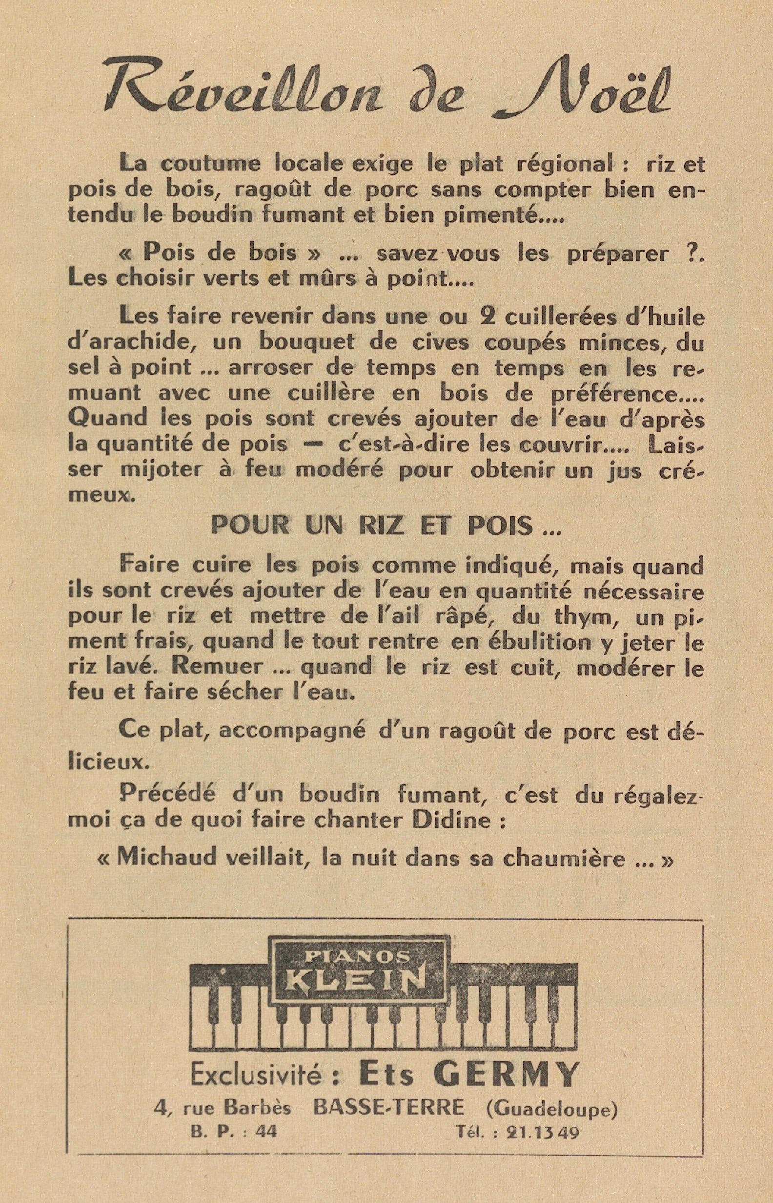 En décembre 1964, pour les festivités de Noël, la couverture du numéro du 17 au 23 décembre se pare d’une cathédrale. Le numéro suivant donne une recette locale qui est sur toutes les tables du réveillon : le consommé de « pois de bois » ainsi que sa variante, le riz et pois. Ce plat accompagne le fameux « cochon roussi ».