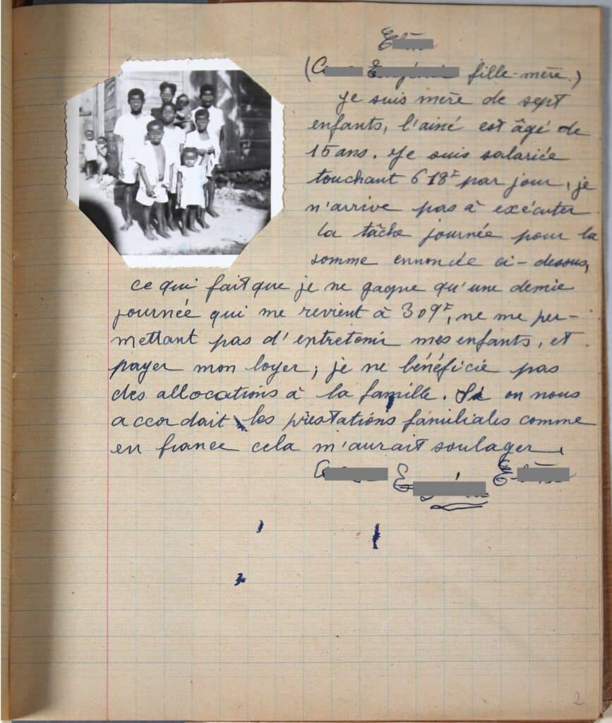 Parmi les pages de ces cahiers, qui sont en fait des cahiers d’écoliers, on retrouve des témoignages manuscrits de familles modestes. Dans l’un d’eux, sur une feuille jaunie par le temps, une mère de famille expose avec dignité les difficultés quotidiennes qu’elle rencontre pour élever ses sept enfants. Elle écrit : « je ne gagne qu’une demi-journée qui me revient à 309 francs, ne me permettant pas d’entretenir mes enfants, et payer mon loyer ; je ne bénéficie pas des allocations à la famille ». À côté de ces quelques lignes, une petite photographie montre cette femme entourée de ses enfants devant leur case.