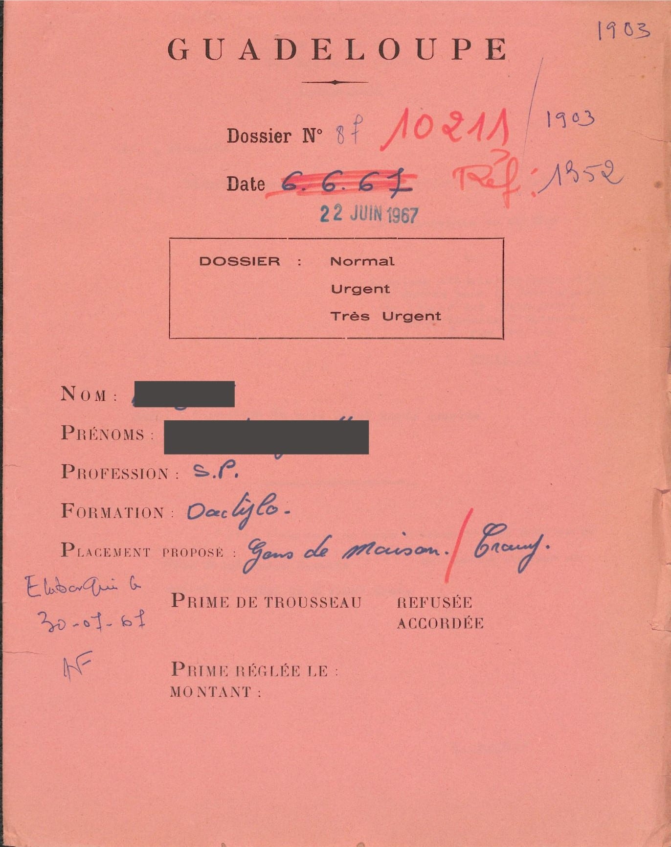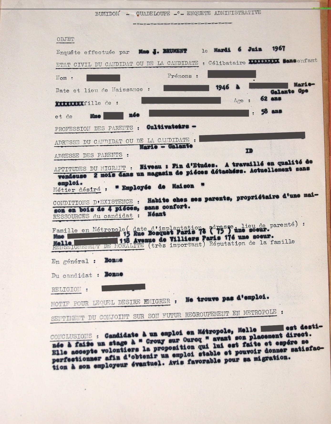 La couverture du dossier nous renseigne sur la candidate : la couleur rose indique que le dossier est celui d’une femme (elle est marron pour un homme) ; figure également un numéro de dossier, que l’administration attribue à toute demande. Dans ce cas, l’instruction se fait sur une durée relativement courte, cinq mois durant lesquels les situations personnelle, professionnelle et sanitaire de la jeune femme sont pris en compte : Lisette D, âgée de 21 ans, n’a pas d’emploi. Elle vient de Marie Galante et s’adresse à l’antenne de Basse-Terre, le 7 février 1967, pour y déposer sa lettre de motivation. La jeune femme écrit qu’elle a la charge d’une malheureuse famille et qu’elle souhaite partir en métropole sous les guides de votre société [le BUMIDOM]. Elle a cessé ses études à l’école primaire mais a fait de la dactylographie. Une série de documents imprimés complètent le dossier : fiche d’état civil, formulaire d’autorisation parentale, demande imprimée de migration pour exercer en qualité d’employée de maison, formulaire à signer informant que seul le billet aller est pris en charge, etc. Le dossier comporte aussi le résultat d’une enquête sociale : profession des parents, aptitude du migrant, métier désiré, conditions d’existence, famille en métropole (Lisette a deux sœurs qui vient à Partis), motif de la migration. L’enquête se conclut par un « avis favorable ».