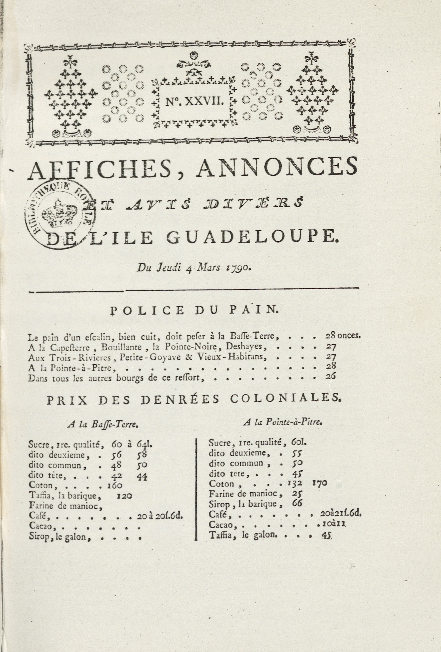 Affiches, annonces et avis divers de l’île Guadeloupe (1789-1790) est un journal commercial administratif.