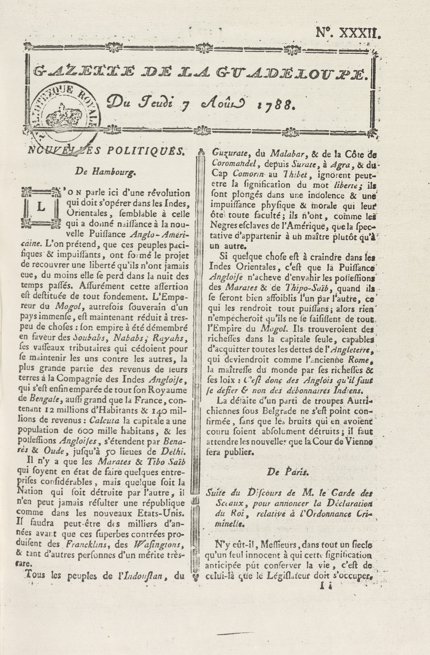 La Gazette officielle de la Guadeloupe (1788-1881) parait de façon hebdomadaire (le jeudi). Elle fournit des renseignements utiles aux colons. Ce journal officiel d’information contient des rubriques telles que des nouvelles politiques, des ordonnances et des règlements, des avis du gouverneur de la Guadeloupe et des avis divers. Les signalements de marronnage sont à chercher dans les avis divers.