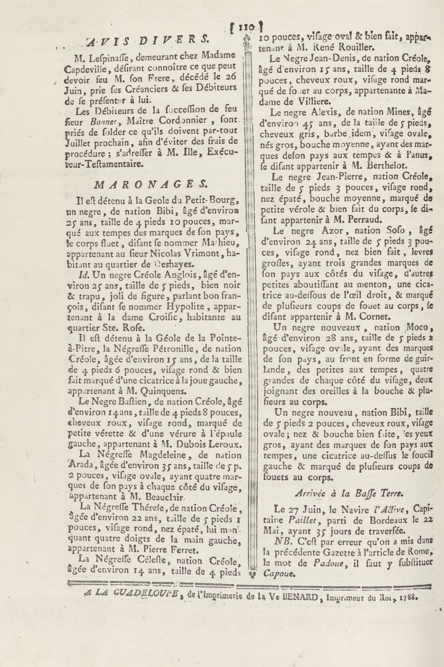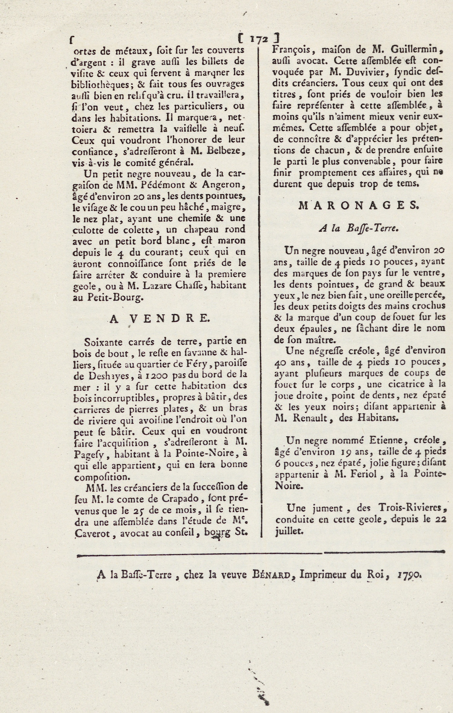 Les sources imprimées viennent compléter les autres sources disponibles sur le marronnage. En apportant des données aussi bien quantitative que qualitative, elles contribuent de manière significative à la compréhension du phénomène de marronnage. En Guadeloupe, les sources imprimées prennent la forme d’annonces publiées dans la presse officielle, notamment la Gazette officielle de la Guadeloupe et les Affiches, annonces et avis divers de l’île Guadeloupe, dans lesquelles on recense des dizaines de signalements de marrons.[1]