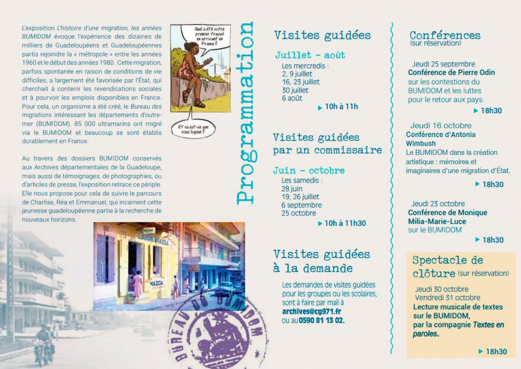 A l’occasion de la prolongation de l’exposition « Histoire d’une migration, les années Bumidom », les Archives départementales sont heureuses de vous présenter le programme associé (visites guidées, conférences et spectacle de clôture).