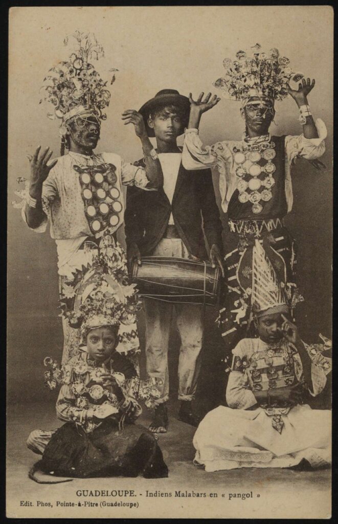 Carte postale intitulée Guadeloupe – Indiens Malabars en « pangol », Ed. Phos, début XXe siècle. Arch. dép. Guadeloupe, 5 Fi 94/1.