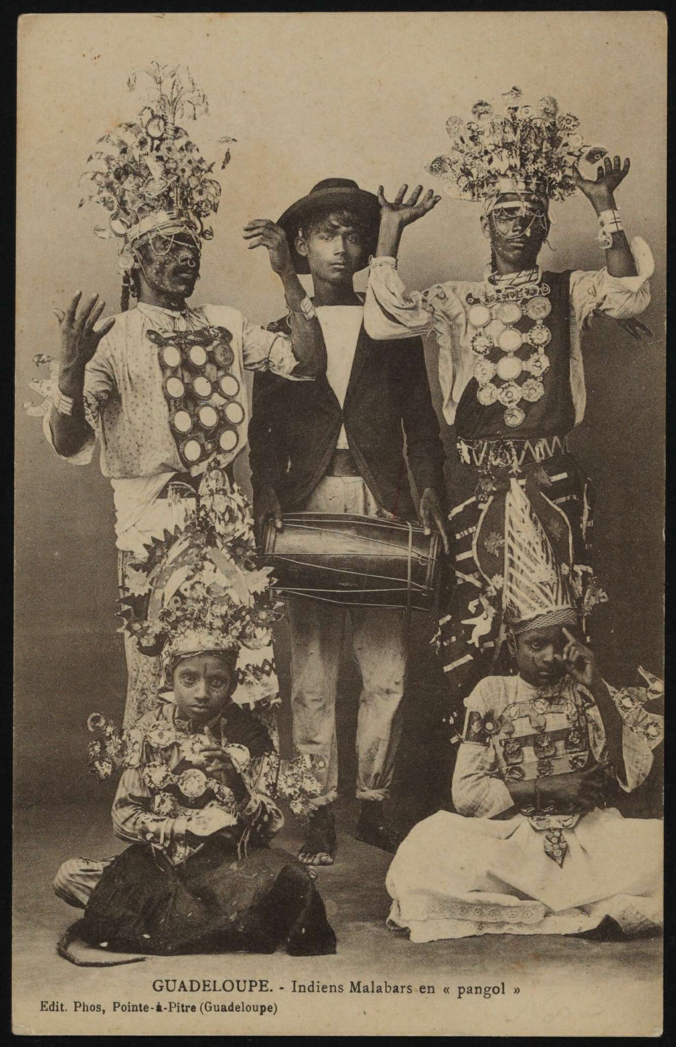 Cette carte postale a été éditée à Pointe-à-Pitre, au début du XXe, siècle par l’éditeur Phos, pseudonyme d’Edgar Littée, le plus important photographe de Guadeloupe entre 1895 et 1912. Elle présente ce qui semble être une cérémonie du « Pangol » très probablement une désignation locale ou une variation orthographique du Pongol (ou Ponkal), qui est une fête religieuse hindoue. Au premier plan, deux personnes sont assises, tandis qu’à l’arrière-plan deux hommes se tiennent debout, les mains levées. Ces gestes peuvent évoquer une mise en scène rituelle ou performative. À l’exception du jeune homme au centre, l’ensemble des personnes portent des tenues, des accessoires et des ornements associés au cadre cérémoniel. Ce jeune homme tient un tambour à deux faces, nommé « matalon », instrument qui rythme les cérémonies qui incluent parfois ce que l’on nomme dans la communauté indienne de Guadeloupe le « nâdron », du théâtre chanté et dansé.