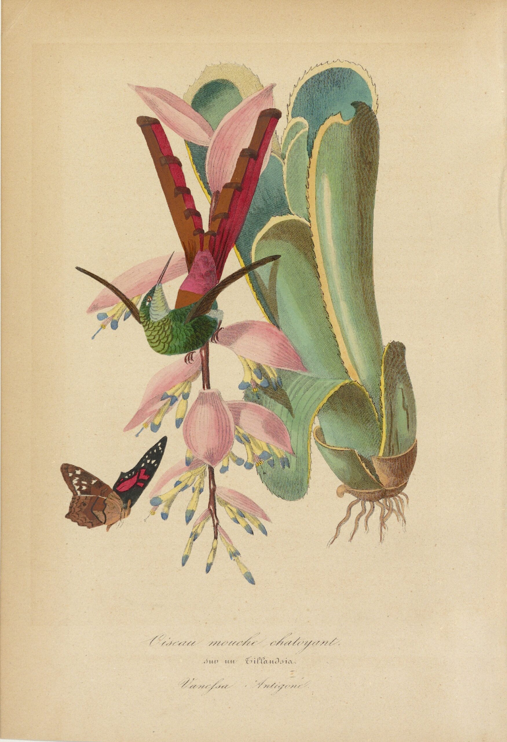 Michel Étienne DESCOURTILZ, Oiseau Mouche chatoyant sur un Tillandsia – Vanesfa Antigone, XVIIIe s. Arch. dép. Guadeloupe, 37 Fi.