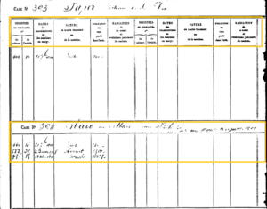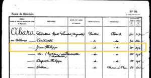 Dans l’exemple ci-dessus, plusieurs individus portent le nom ABARO (cf. 1ère colonne), je recherche donc dans la seconde colonne concernant le prénom. Je trouve ici notre Jean-Philippe. J’apprends ici qu’il était cultivateur et était domicilié au Moule.