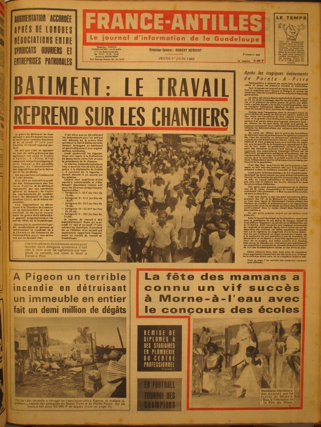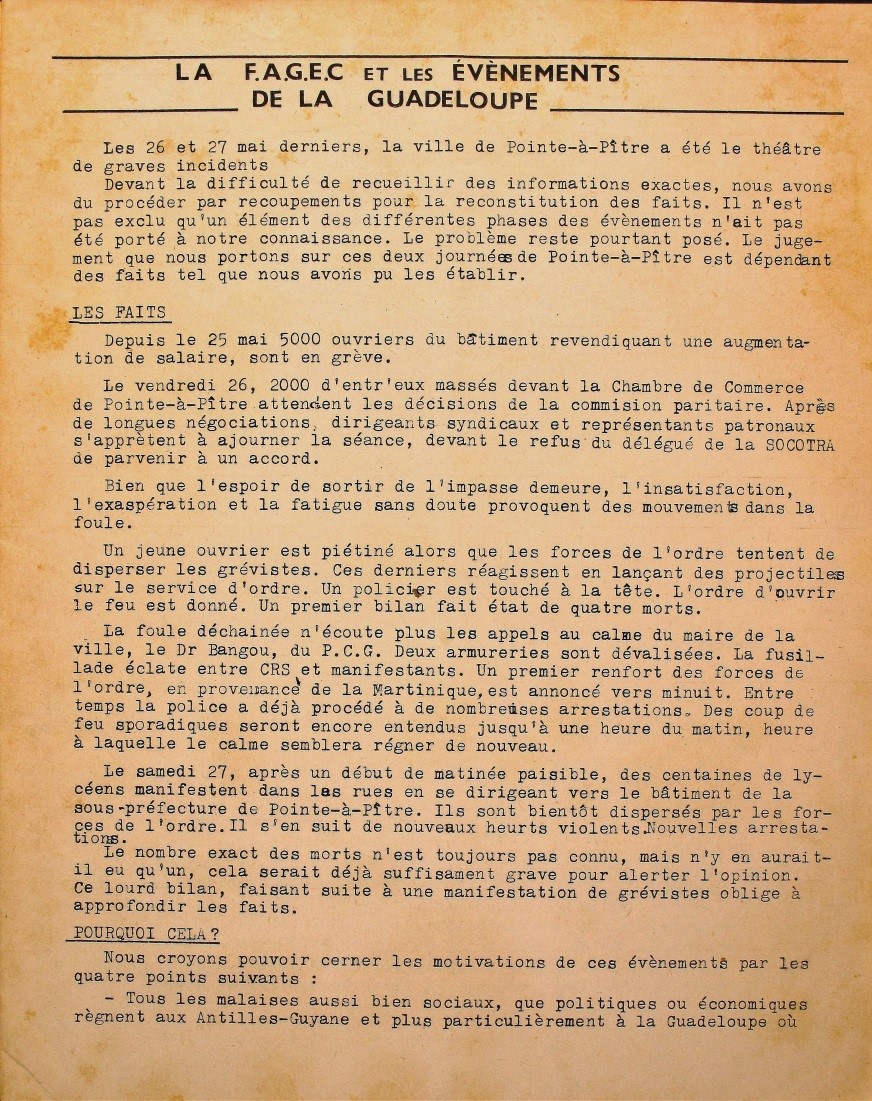 Depuis le mercredi 24 mai, selon l’agence Associated Press, près de « 5000 ouvriers » du bâtiment sont en grève, demandant une augmentation de salaire. Le 26 mai, plus de 2000 ouvriers se ressemblent à Pointe-à-Pitre afin d’attendre l’issue des négociations entre syndicats et patronat. La réunion est un échec, ce qui suscite la colère des ouvriers rejoints par d’autres manifestants dont les jeunes des faubourgs de Pointe-à-Pitre. Un CRS reçoit un projectile dans l’œil, c’est alors que les CRS tirent… La répression est violente et les tirs se font entendre pendant plusieurs heures. Jacques Nestor, l’un des principaux meneurs du GONG, tombe mortellement blessé. S’engagent alors de violents heurts entre la police et les manifestants. Des armureries sont dévalisées. Le bilan officiel compte sept morts et de nombreux blessés mais le chiffre exact des victimes demeure à ce jour inconnu.