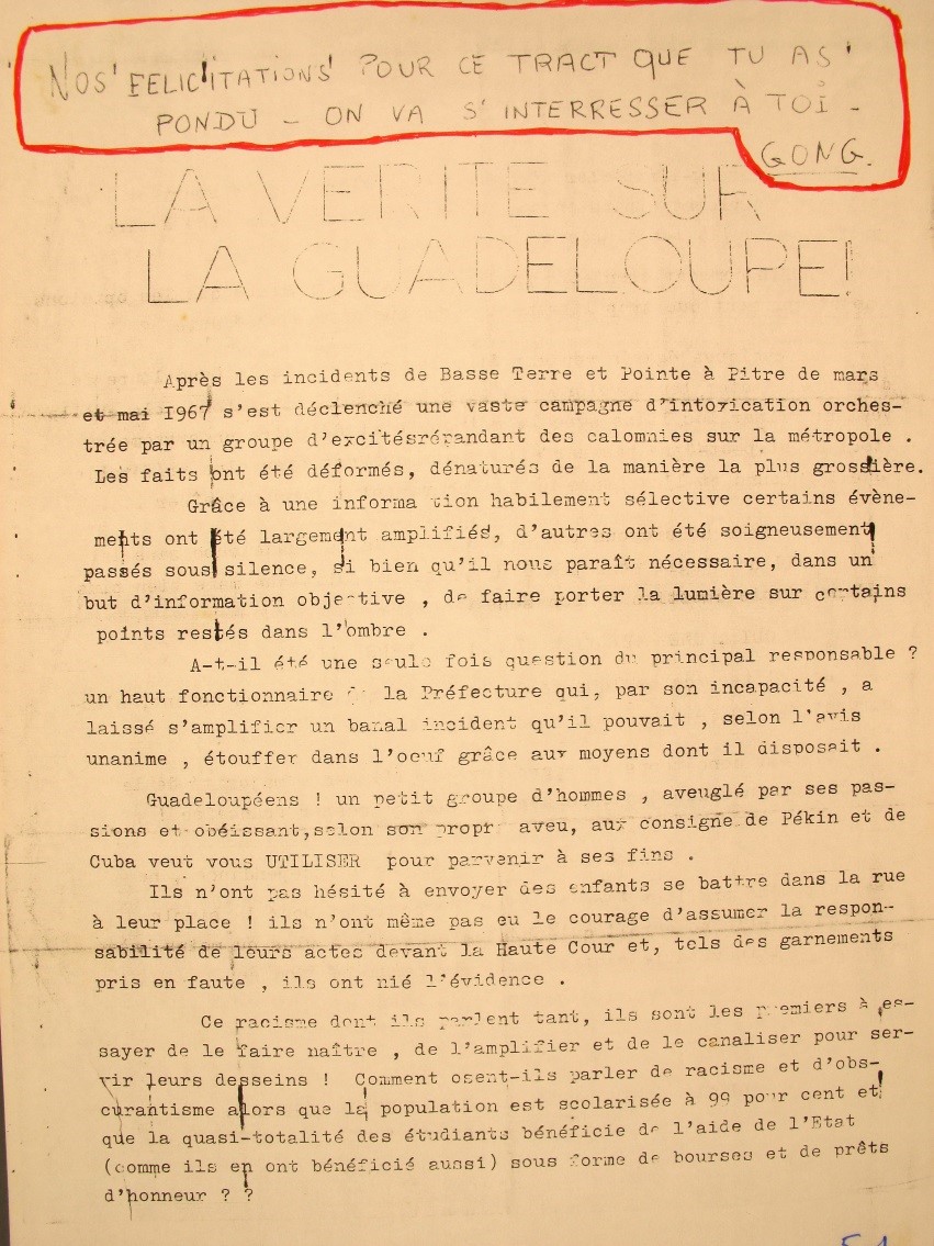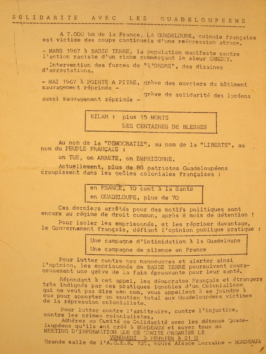 Les organisations d’étudiants guadeloupéens et antillais organisent en France métropolitaine des manifestations de soutien à Paris et dans certaines villes universitaires comme en témoigne l’un des tractes conservés aux Archives départementales de la Guadeloupe.